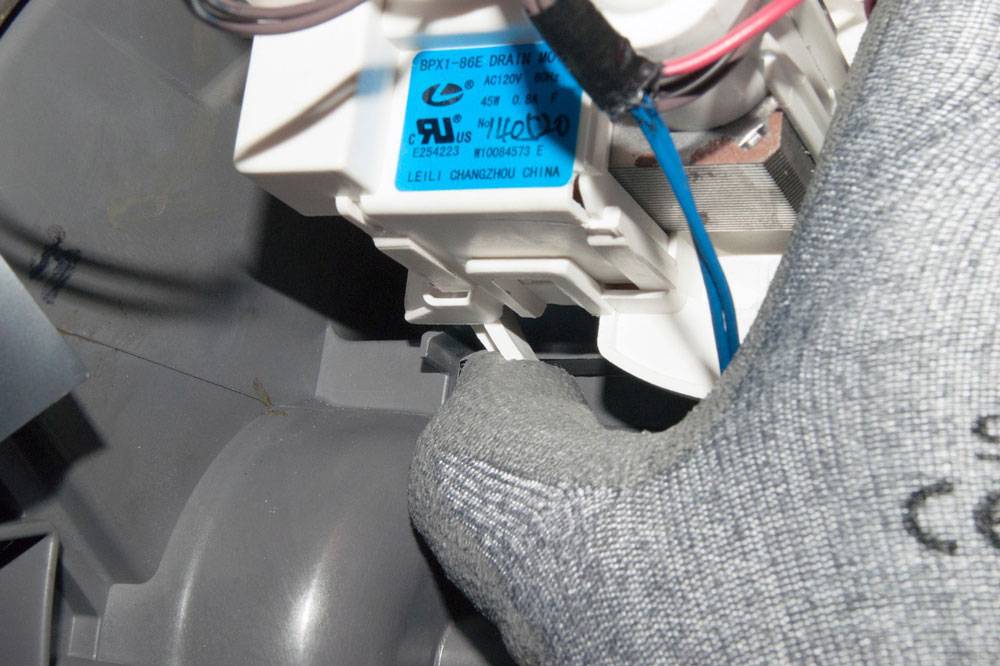 Все детали зачастую находятся в связке. Вытащите фишки проводки двигателя. Сбоку вы увидите дренажную помпу. Захватите узел и прокрутите в пол-оборота.