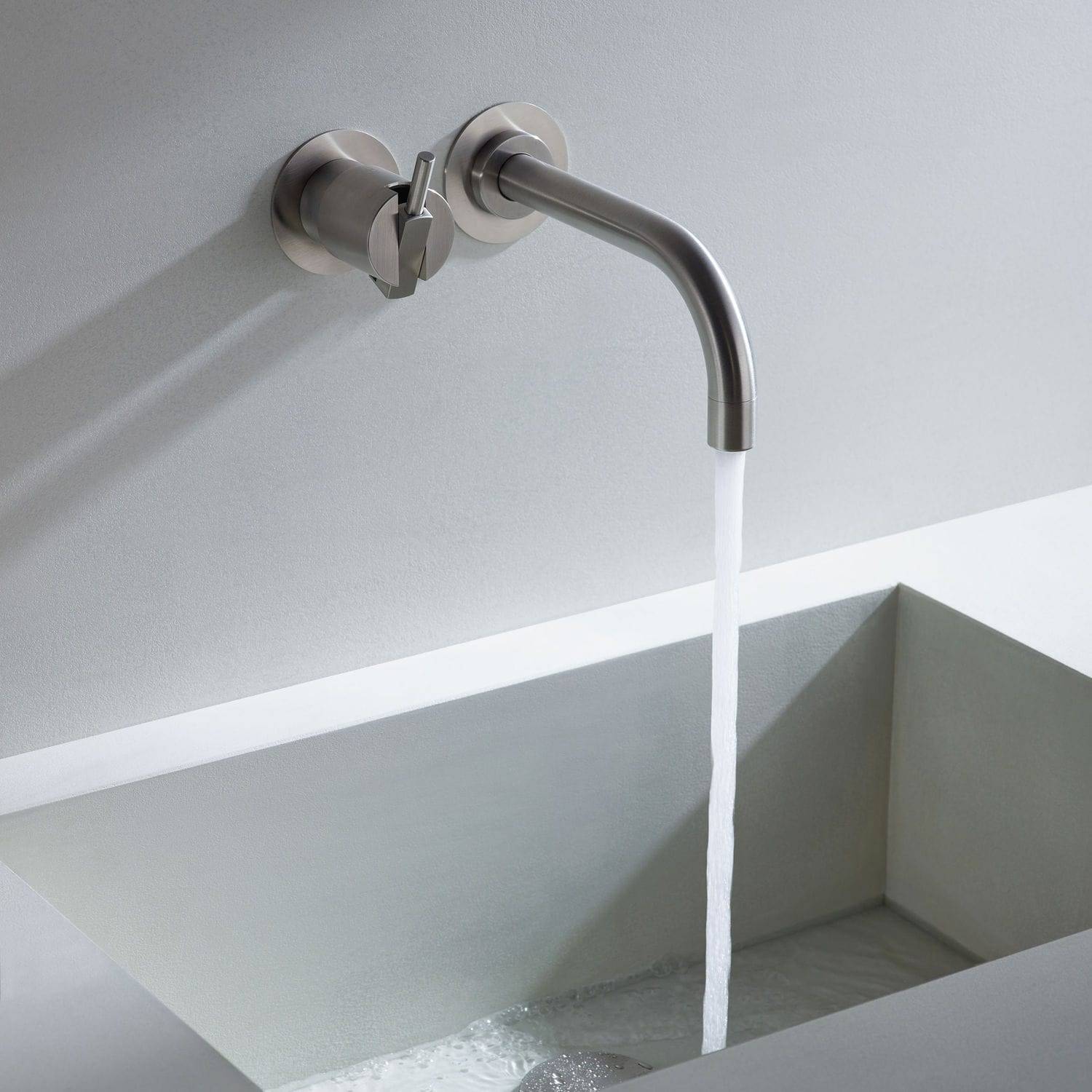 Настенный смеситель жестко соединяется с водопроводными трубами. Регулировка температуры и напора воды выполняется рычагом или кран-буксами. Его излив зависит от конкретного смесителя, имеет встроенный аэратор. Такому смесителю требуется периодическая чистка, так как со временем он может засоряться от жесткой воды.