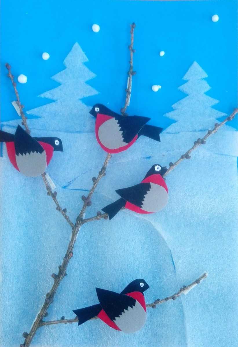 А вот еще одна аппликация с зимними птичками. Особое очарование этой поделки придают детали, вырезанные из газеты.
