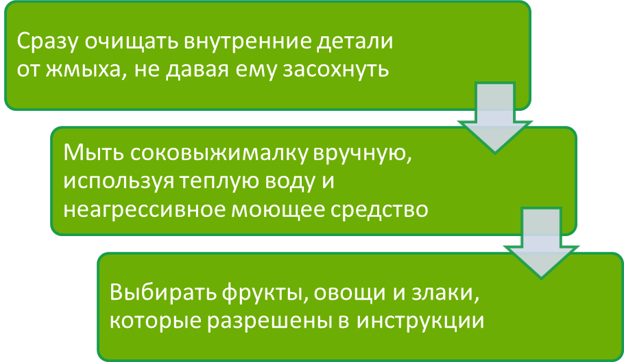 - Работа устройства ограничивается по времени. Причиной этого является нагревание двигателя, что может привести к снижению качества сока. Поэтому многие современные устройства оснащаются специальными терморегуляторами, которые автоматически отключают соковыжималку при перегреве.
