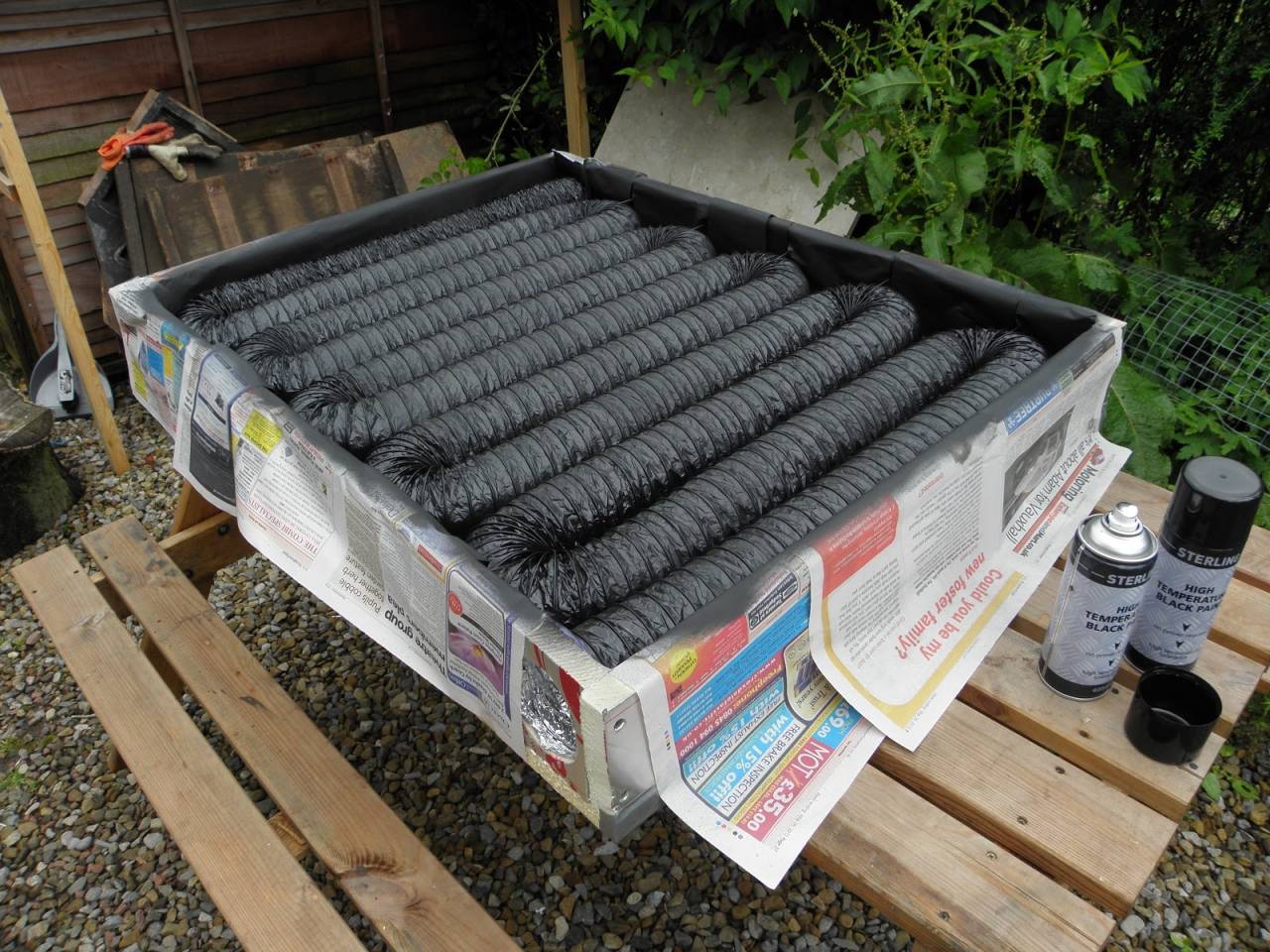 - Во внутреннею поверхность плотно закрытого утепленного короба можно ставить отражающий материал (фольгу), но тут он закрепляется на черном резиновом коврике. Это также эффективный вариант, так как темный цвет лучше притягивает лучи, аккумулирует тепло.