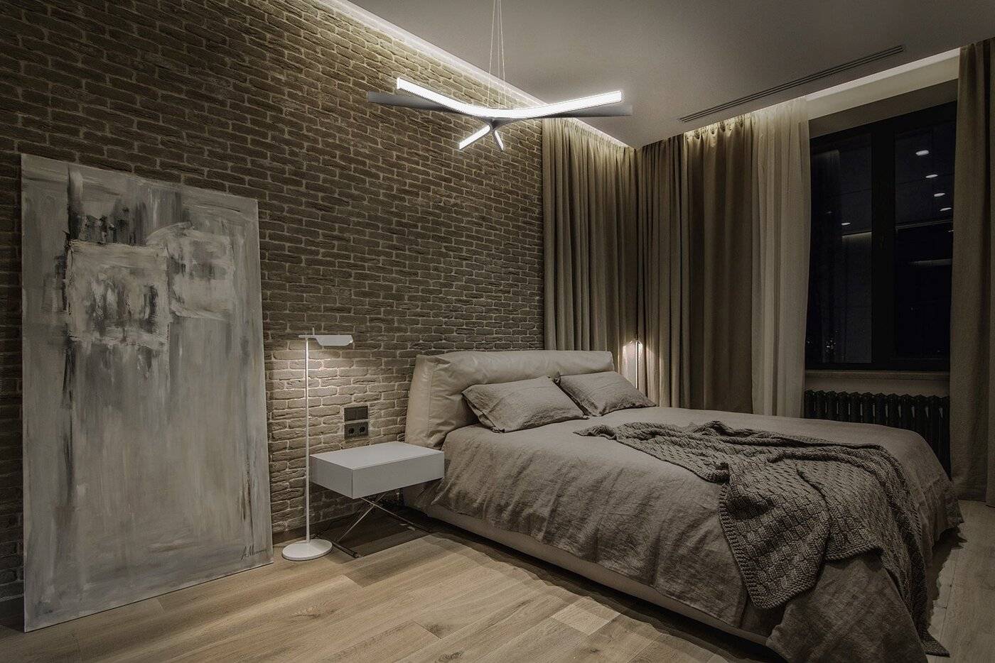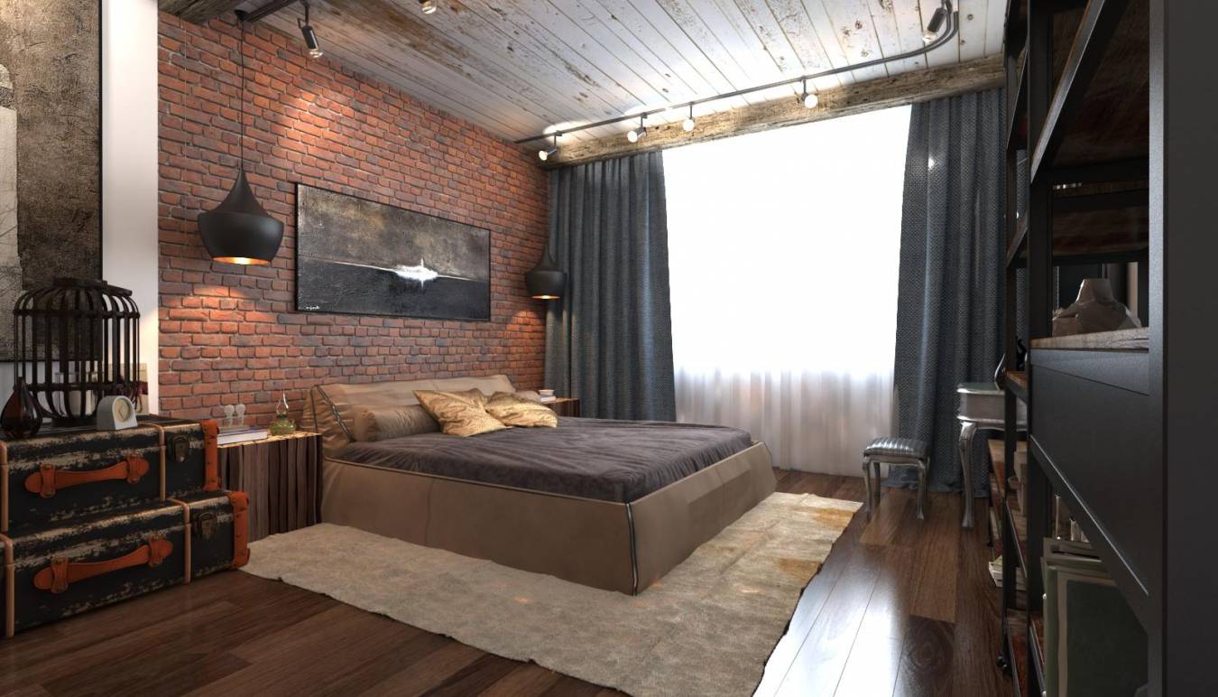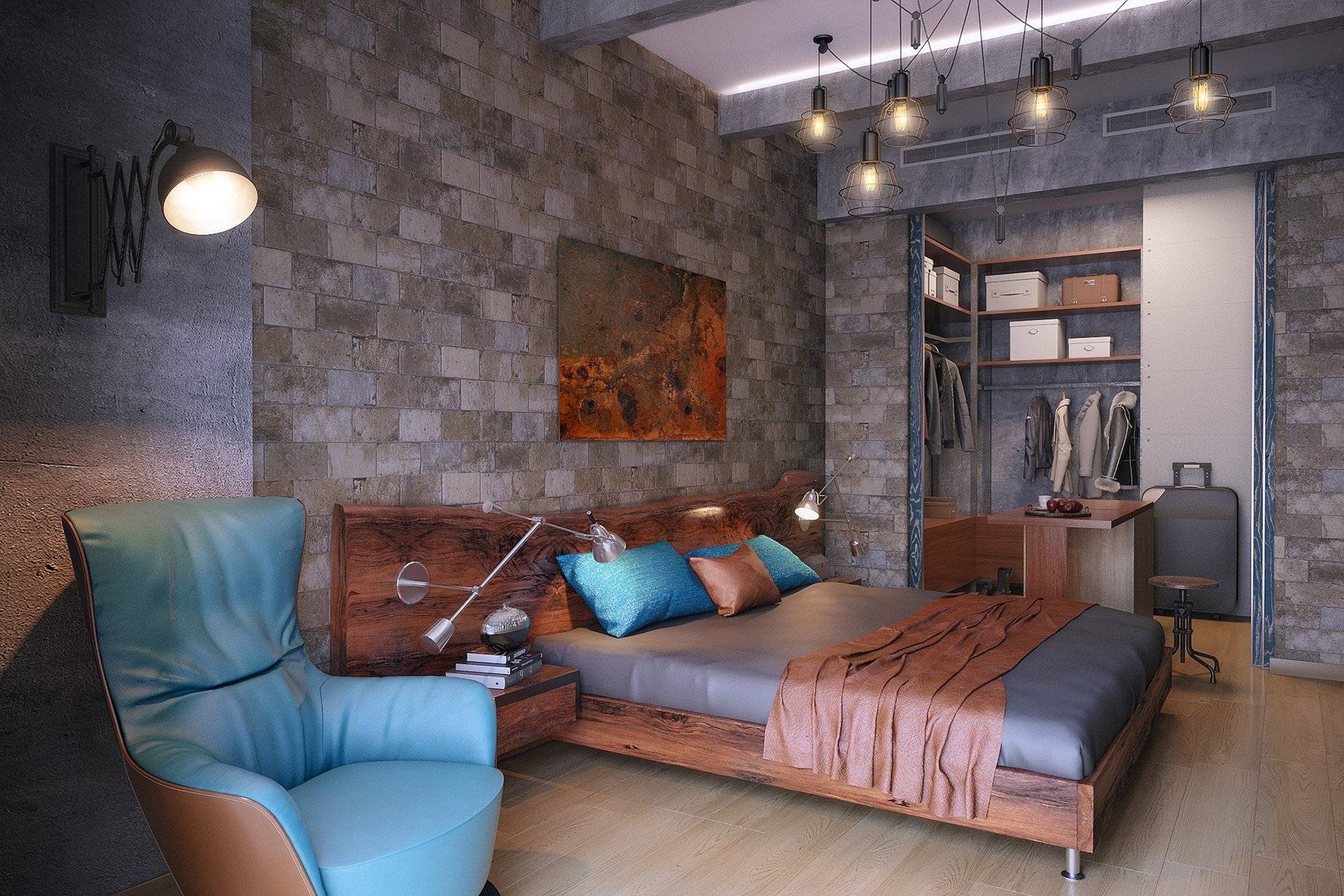 При оформлении такой спальни стоит обратить внимание на использование фактур (кирпич, бетон)