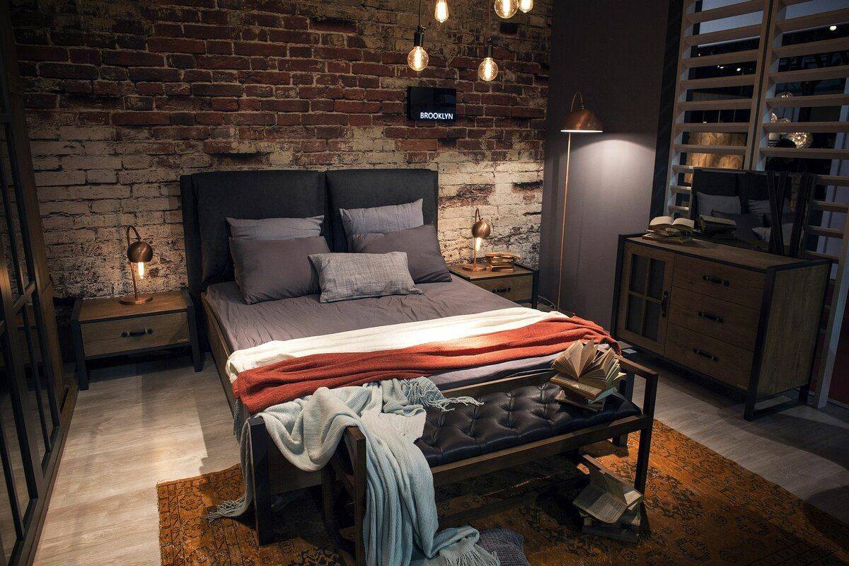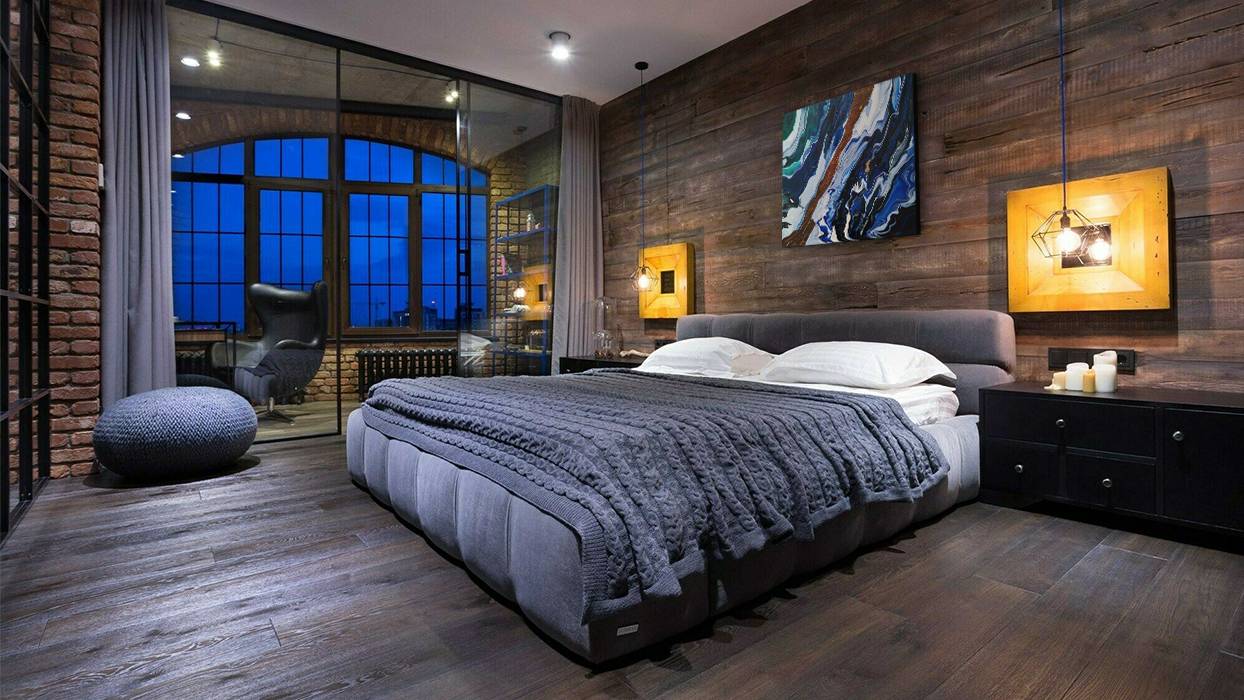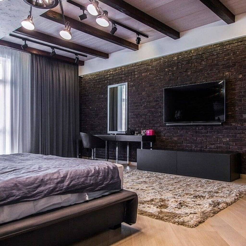 При оформлении такой спальни стоит обратить внимание на использование фактур (кирпич, бетон)