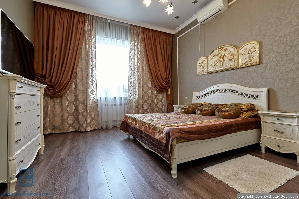 Классика необязательно бывает светлой: черный мрамор, кожа, лакированное дерево добавят в обстановку роскоши. Линолеум, ламинат, мрамор, паркет — любое из этих напольных покрытий будет уместным. Мебель из дорогих пород древесины с элементами художественной ковки прекрасно впишется в такую спальню. Оформить в классическом стиле можно спальню любых размеров, что является еще одним его преимуществом.
