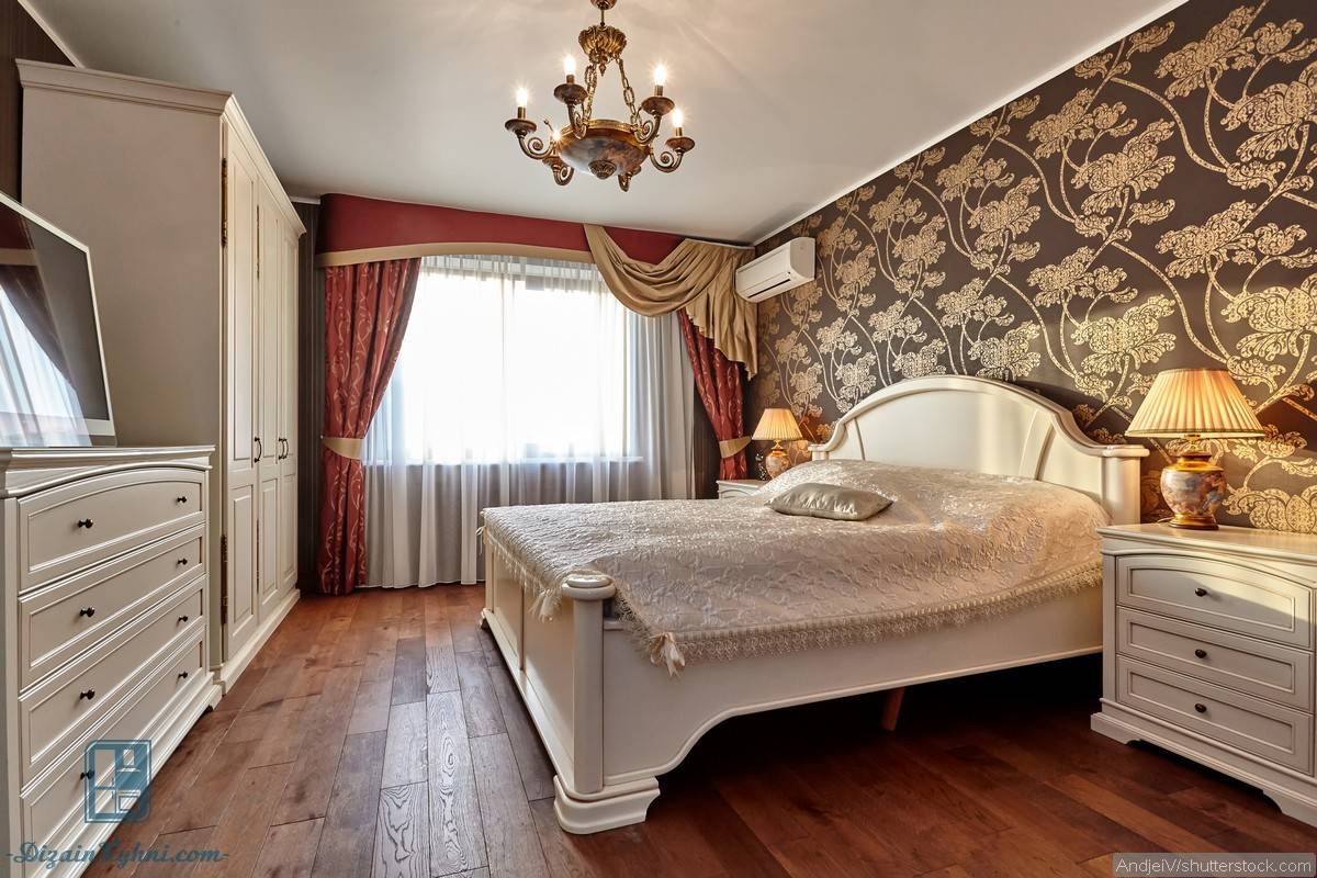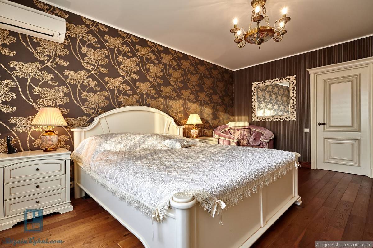 Классика предполагает уютную, спокойную обстановку, не утяжеленную яркими деталями и новшествами. Уместна будет дорогая мебель из натуральной древесины, с резными элементами. Потолок лучше сделать белоснежным или светло-бежевым, приветствуется наличие лепнины. Стены желательно отделать светлыми материалами. В традиционном стиле выгоднее комбинировать с коричневым, либо золотистым. Позолотой можно покрыть ножки массивной кровати или изголовье. В качестве декора поставить золотистые подсвечники, блестящие светильники, бра.
