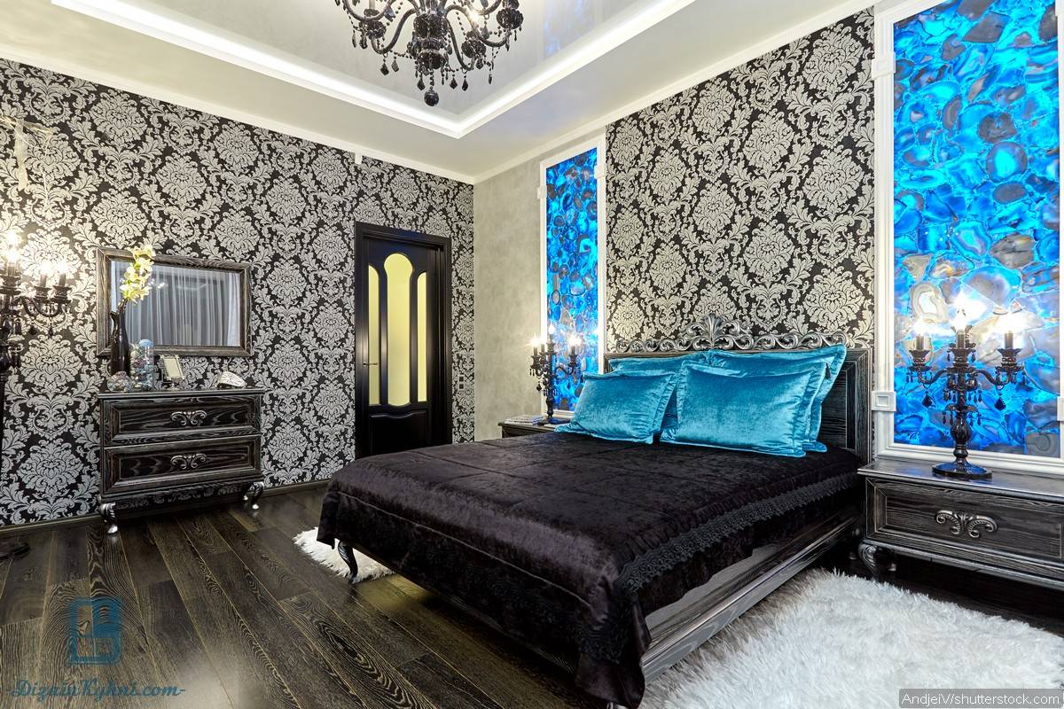 Черная мебель великолепно оттенит фиолетовые, сиреневые обои, покрытия для стен цвета кофе с молоком или шоколада. Сочетание одинаково строгих тонов в интерьере спальни сделает её излишне камерной и холодной.