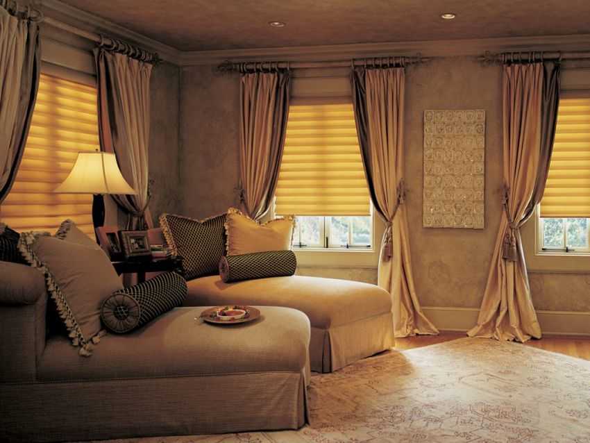 В монохромном интерьере обычно используют двойные шторы с разной цветовой гаммой. Они не должны повторять оттенок обоев на стенах. Песочные тона прекрасно гармонируют с тюлем небесной голубизны на фоне шоколадно-бежевого интерьера опочивальни.