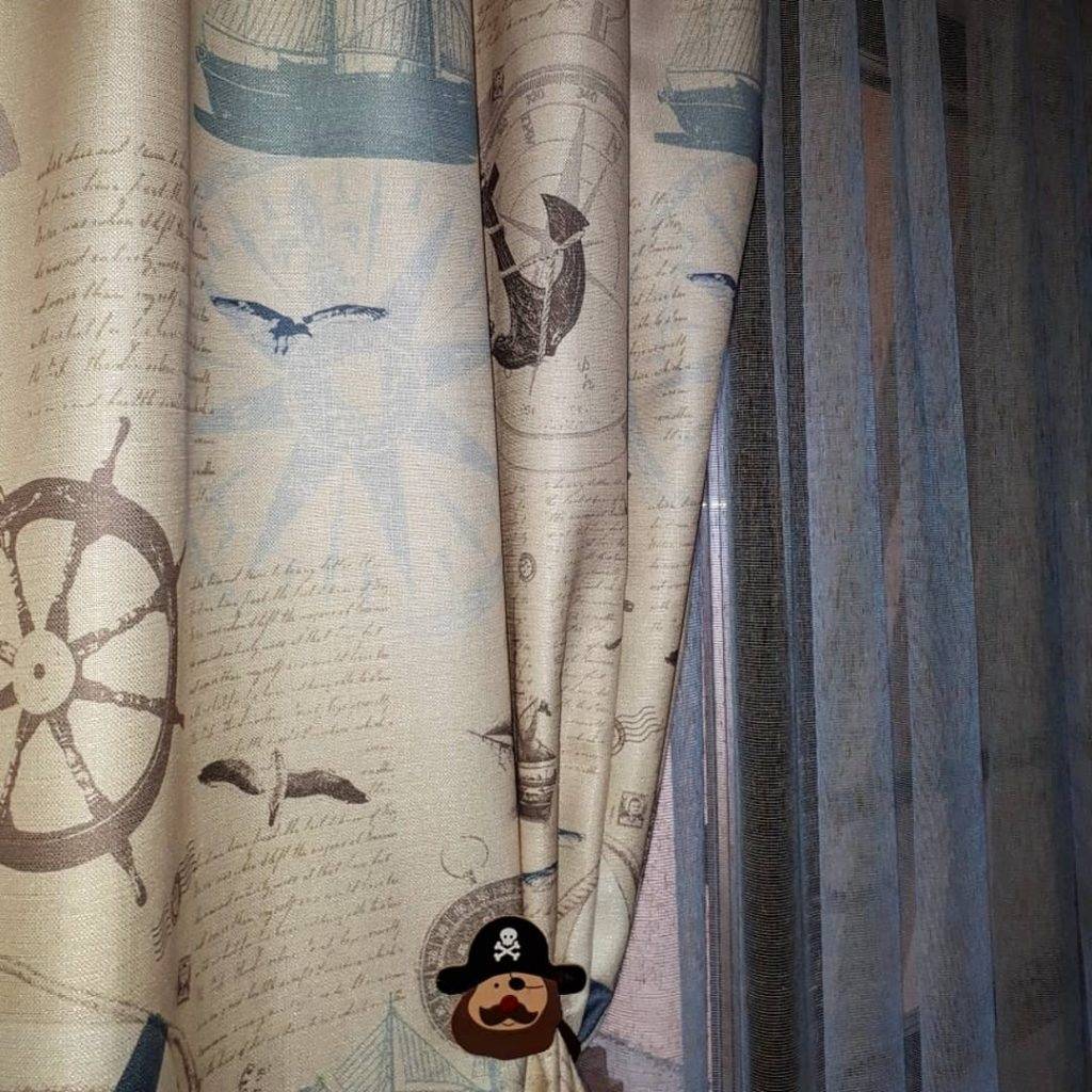 Для мальчика шторы в морском стиле в детскую комнату могут быть и пиратской тематики, с вызывающими рисунками Джека Воробья, бочек с порохом, деревянного пиратского корабля. Это нетривиальное оформление понравится юному озорнику – искателю приключений возраста 8-14 лет, который уже знаком с произведениями о морских пиратах и их проделках.