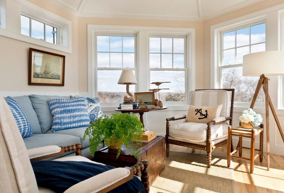 Уютная гостиная частного дома, оформленная в морском стиле