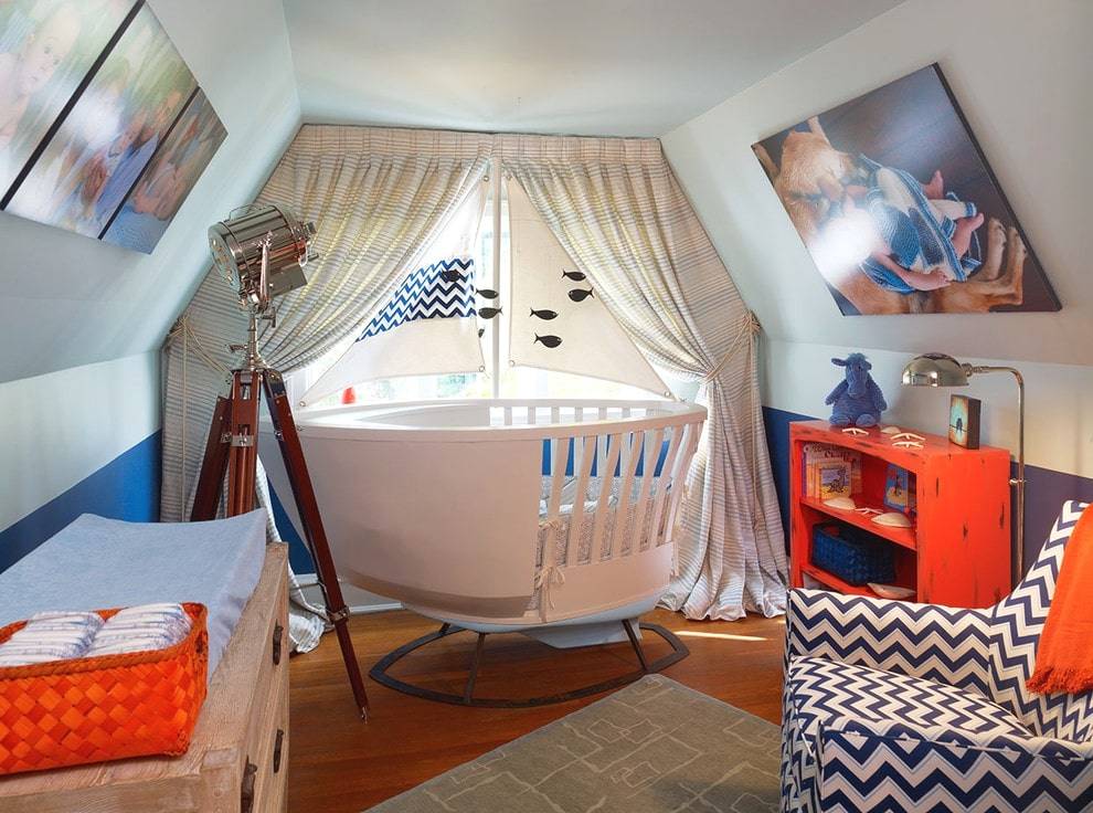 В детской для новорожденного уместно сделать синее, бирюзовое или серое оформление стен с добавлением полосатого принта или нескольких красивых панно. Разнообразные тематические аксессуары в виде штурвалов, якорей или корабликов будут увлекать малыша и дарить ему положительные эмоции. Стены в комнате можно украсить наклейками, трафаретами или даже объемными фигурами.