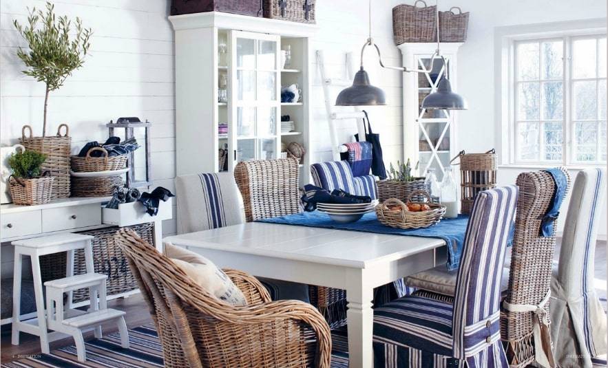 В морской стиль отлично вписывается деревянная или плетенная мебель