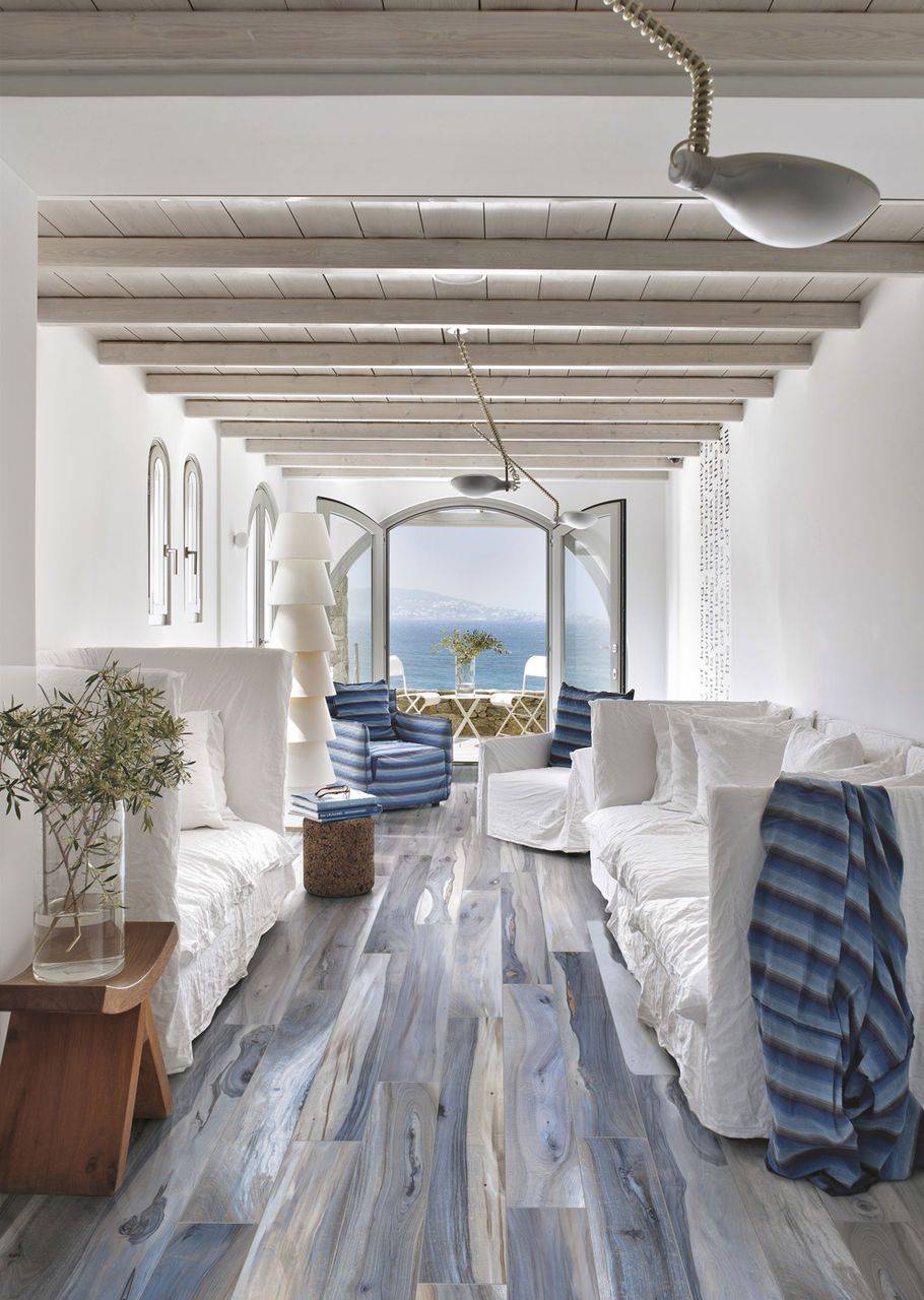 Идеальный морской стиль в интерьере невозможен без полов из древесины, панелей и слегка состаренной мебели. Природный материал также уместен в виде полок.