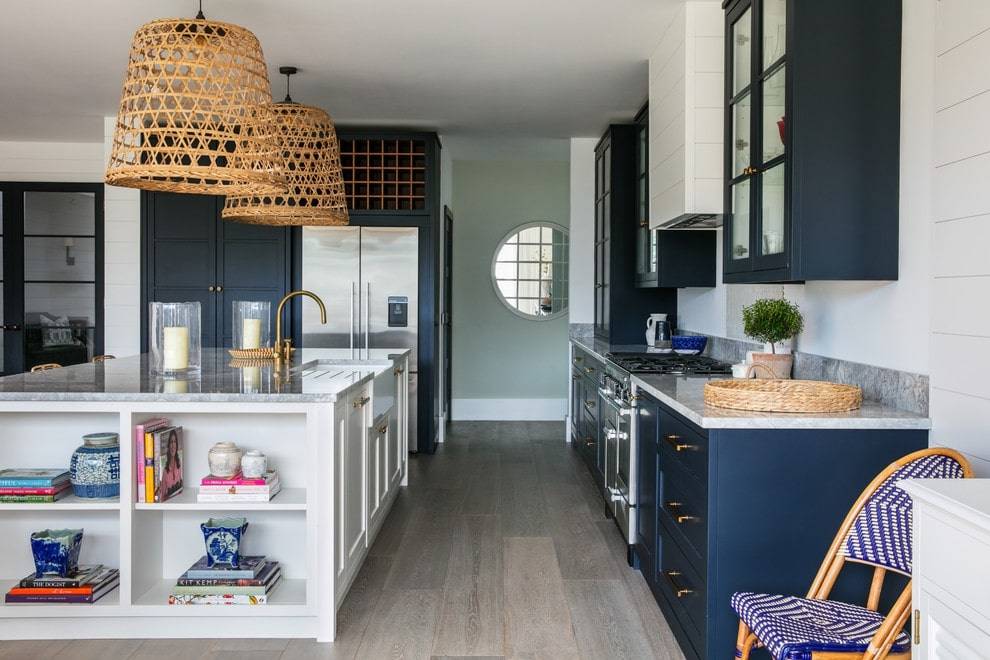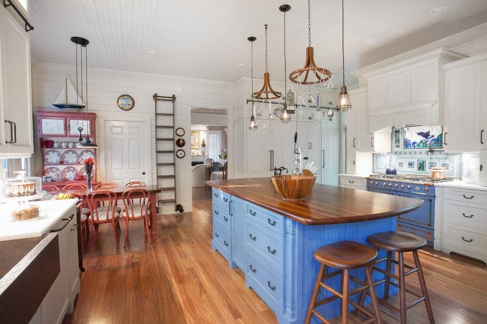 Комнату хорошо дополнить аксессуарами в тематике корабельной кухни – набором висящих сковородок, часами в виде корабельного штурвала, деревянной мебелью в натуральной или белой расцветке, создав свежий средиземноморский дизайн.