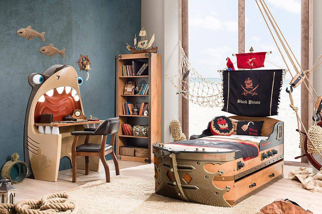 Стены в комнате украшают рисунками с географическими картами, старыми свитками или пиратскими кораблями. Наделить атмосферу нужным настроением помогут разные аксессуары, например игрушечная пальма, бунгало, доски для серфинга или гамак.