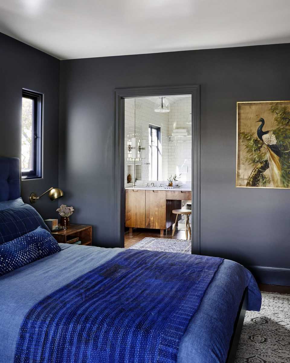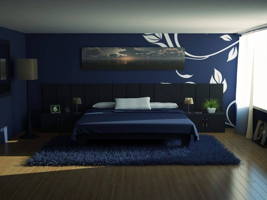 Стандартным вариантом применения синего в интерьере является отделка стен. Этот цвет делает просторные помещения уютней. Маленькой спальне тёмная акцентная стена придает глубины, расширяя или сужая комнату – всё зависит от площади применения. Для оформления используются обои, краска, декоративная штукатурка или деревянные панели.