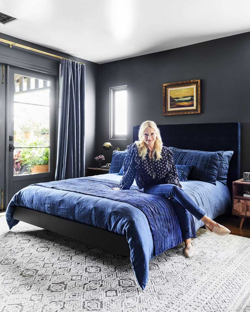Синяя кровать с мягким изголовьем в интерьере спальниИсточник yellowhome.ru