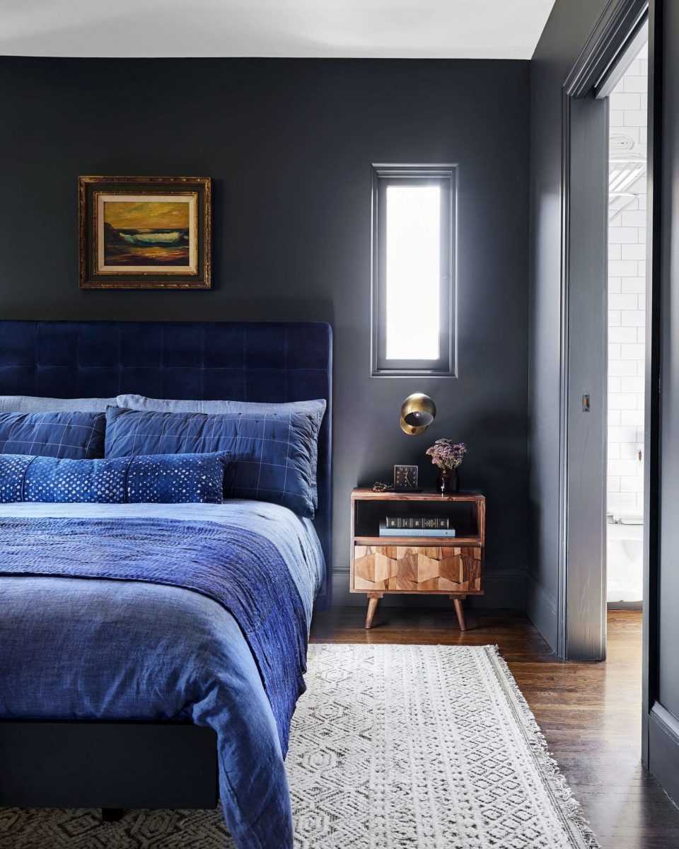Выбирая в синих тонах, можно выбрать настоящее дерево или просто имитацию коричневого цвета. Дерево всегда отлично смотрится с синими оттенками, но при тёмном дизайне куда более высокое положение займёт белая кровать с мягкой обивкой.