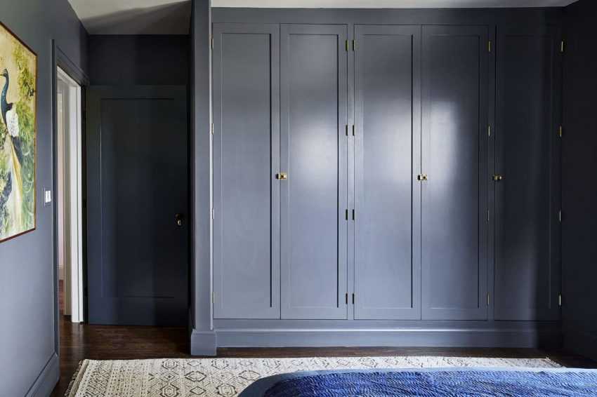 - белоснежный и бежевый — все нынешние модели мебели, а также двери яркого цвета, насыщенно смотрятся на фоне темно-синей поверхности стены;