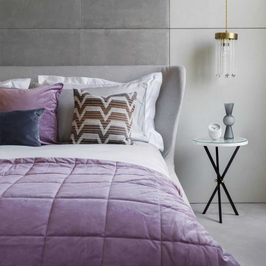Для создания в интерьере спальни спокойной размытой атмосферы можно в комбинации с фиолетовым цветом использовать серые оттенки и светло-коричневые.