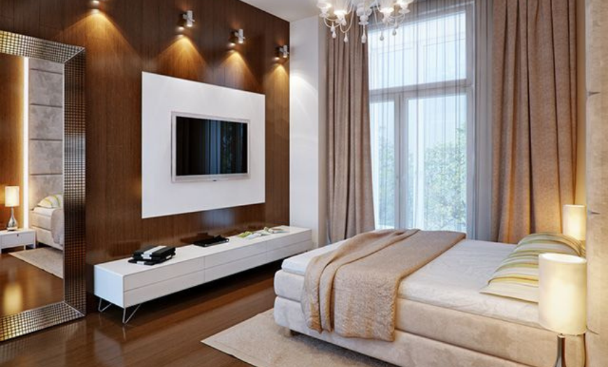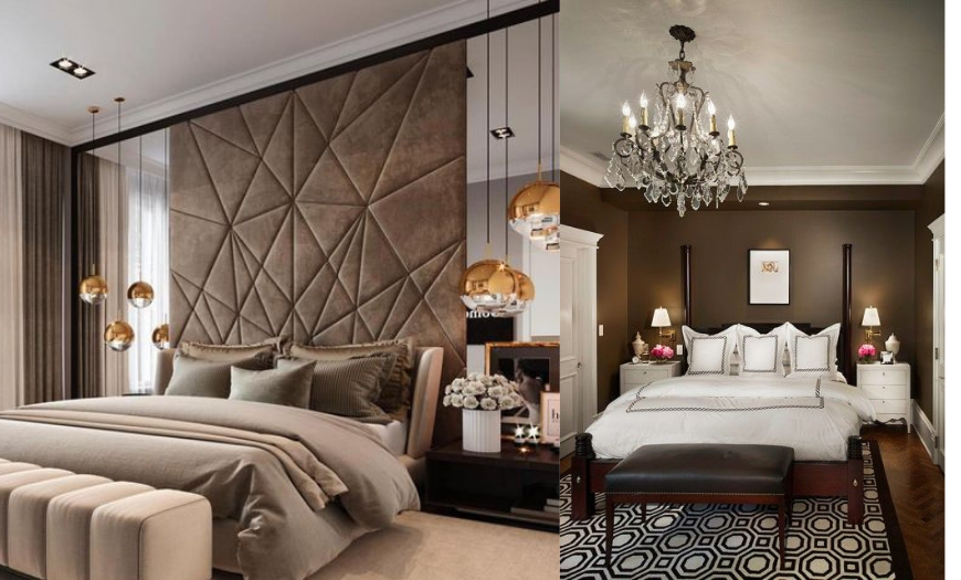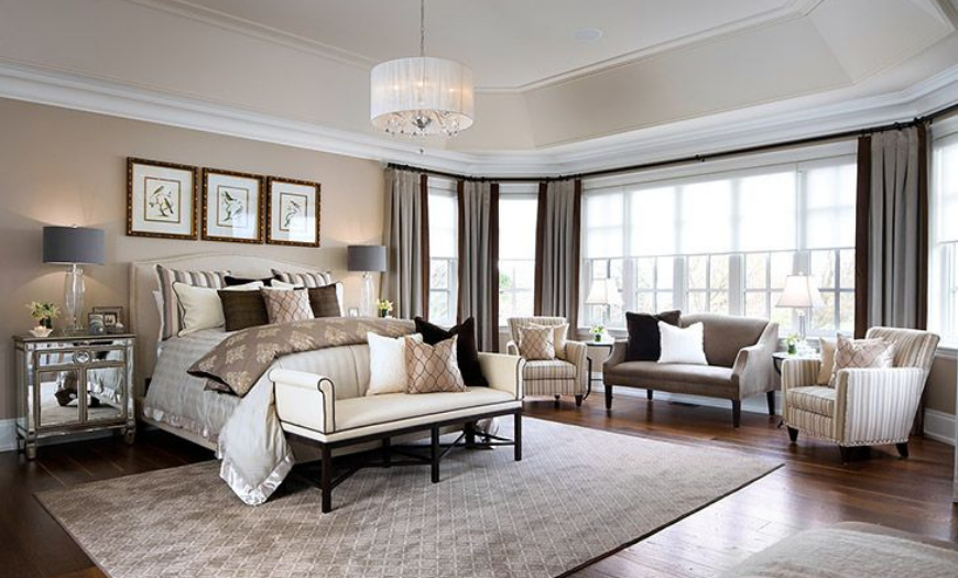 В дизайнах спален уместны недешевые бежево-шоколадные и кремовые тона.