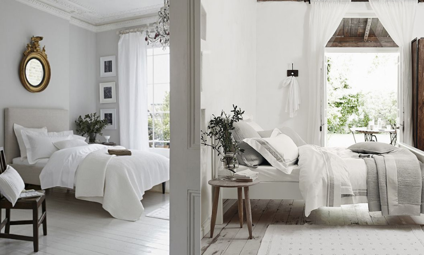 Светлая спальня в таком стиле будет выглядеть изящной и гармоничной при использовании двух видов материалов: однотонных стен, формирующих общий фон, и узорчатых покрытий светлого оттенка, создающих акцент на прикроватной зоне.
