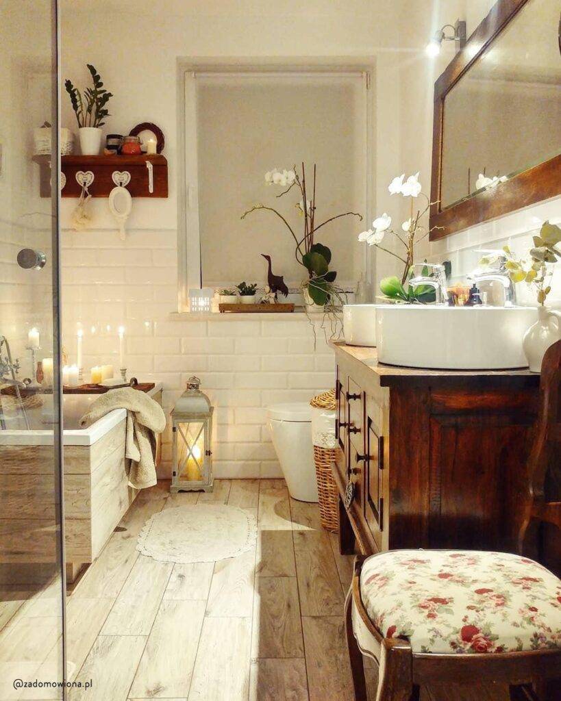 Кроме того, не избегайте украшений, которые обычно появляются в гостиной или спальне. Ваза с цветами, лестница, прислоненная к стене, коврик из искусственного меха или декоративные бутылки и графины на полках. Все это сделает интерьер уютным и теплым. Деревянные вешалки для полотенец, табурет, посуда — вариантов использования дерева в ванной масса.