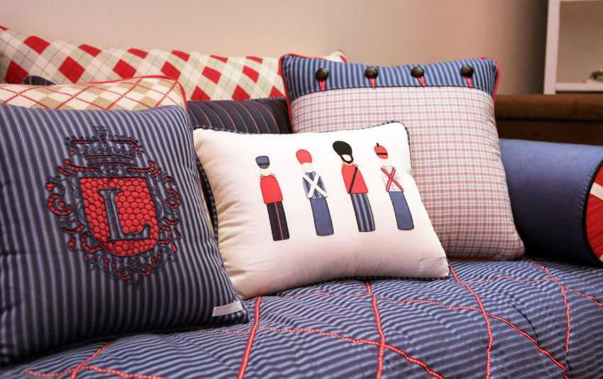 Обилие ткани. Как правило, в комнате в английском стиле существует большое количество текстиля. Это подушки, элементы декоры, которые придают особую атмосферу. Самое интересное, что вы можете использовать любые лоскутки, которые есть у вас дома. Их можно применить для пошива одеял или подушек.