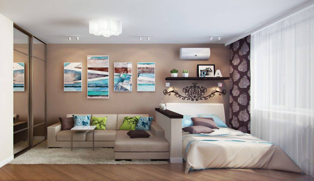 Зона для приема гостей предполагает обязательную установку дивана. Подойдет, как прямолинейная, так и угловая конструкция. Диван в основном располагают спинкой к спальному месту. Маленькое помещение лучше обустроить раскладным диваном, компактной модульной стенкой или купейным шкафом с зеркальным фасадом.