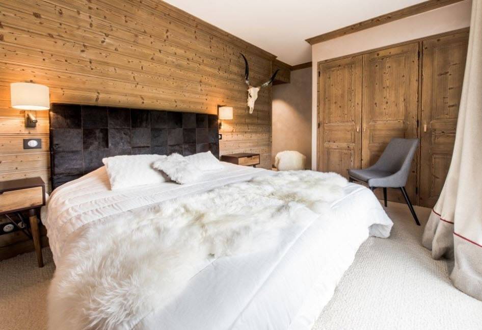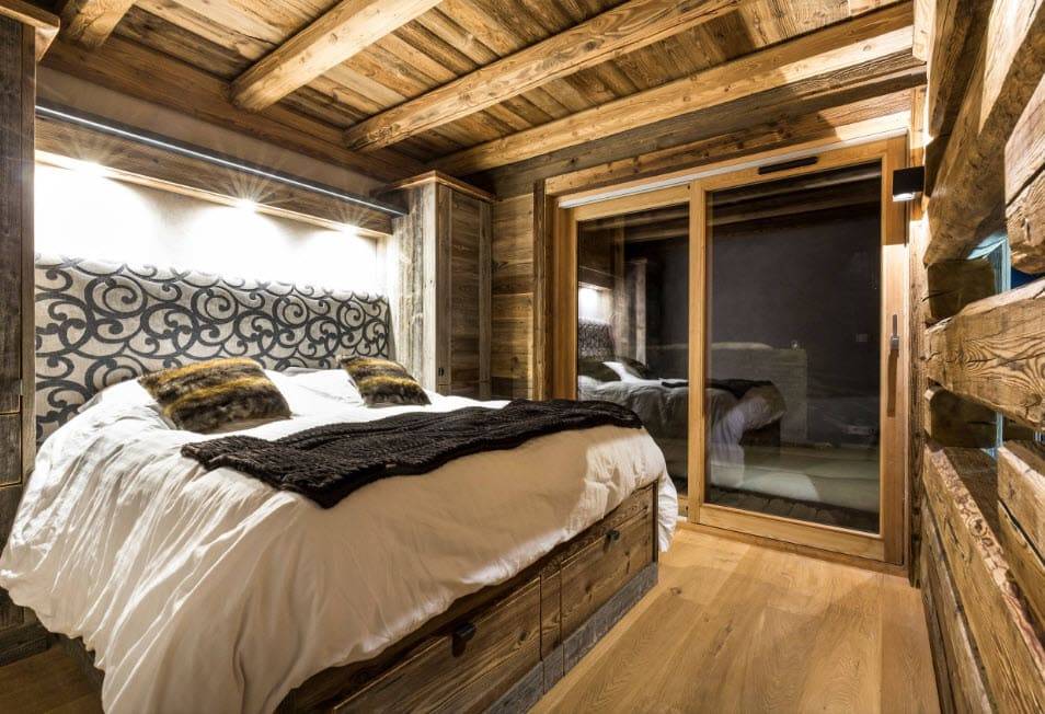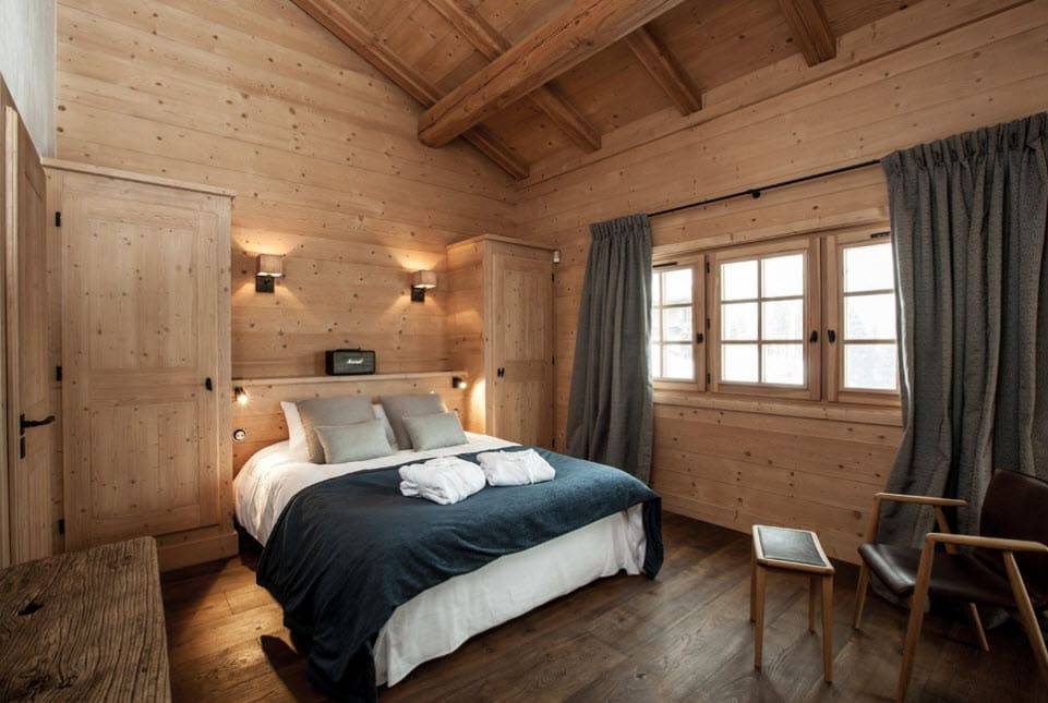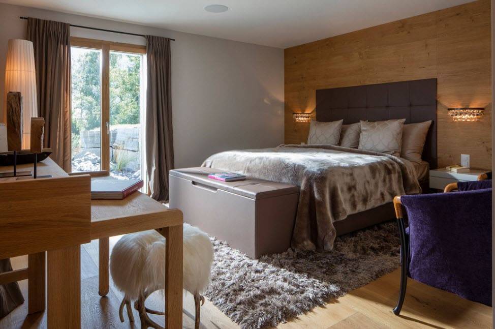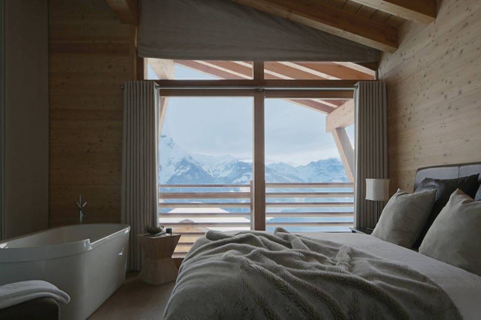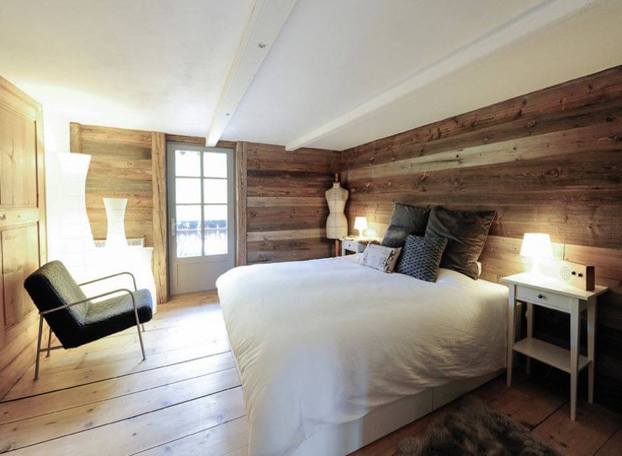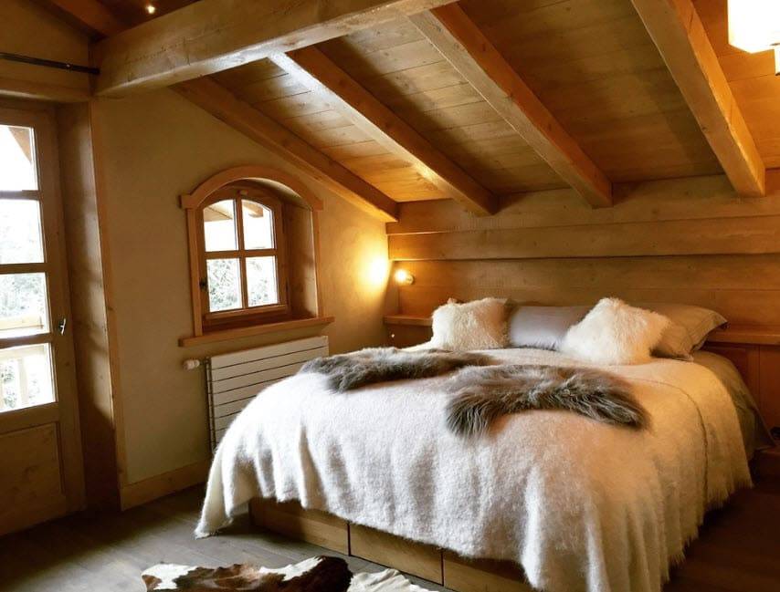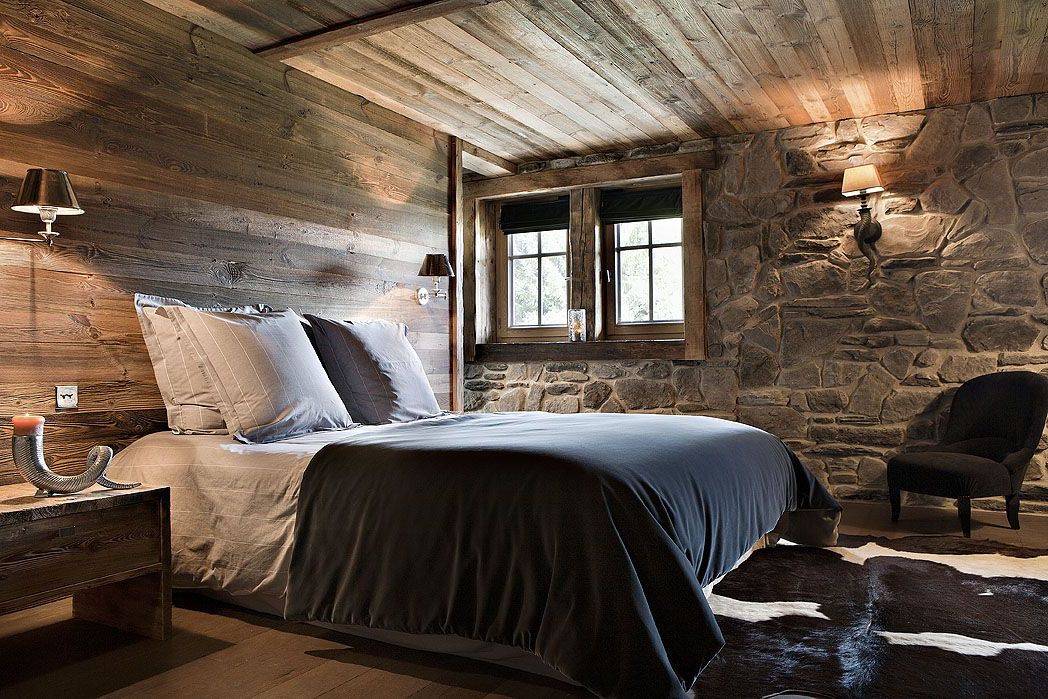 Уютный и натуральный альпийский стиль шале в интерьере спальни