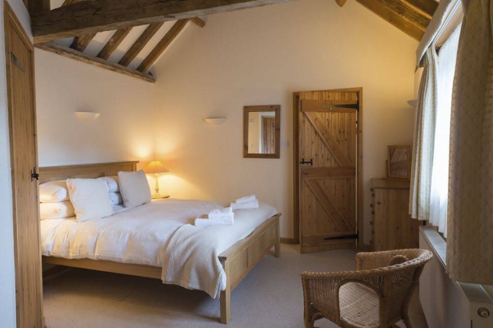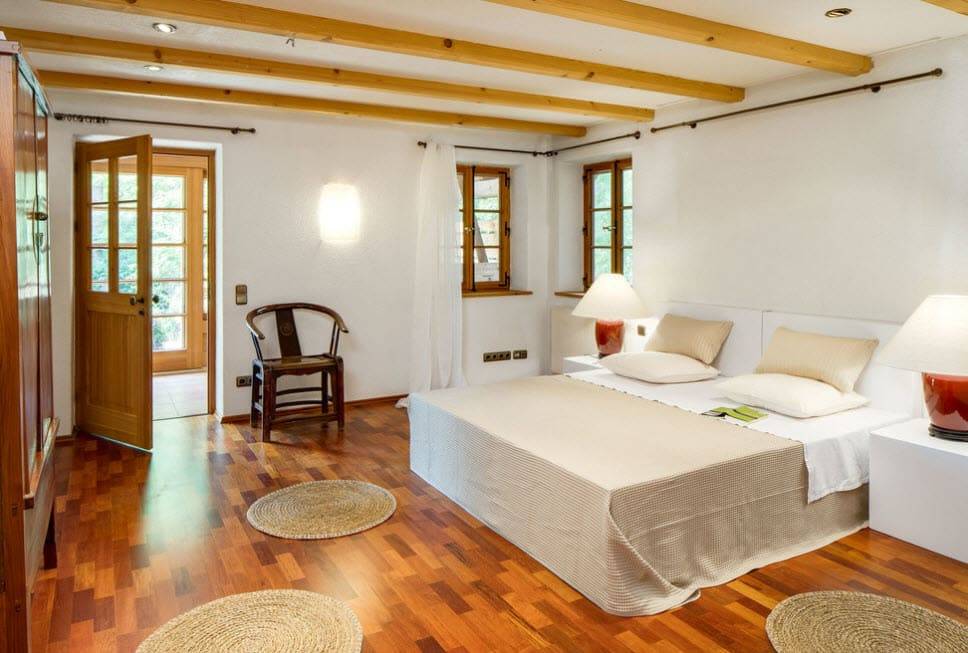 Если спальня находится на мансарде или просто под крышей, то закрывать балки совсем не нужно, достаточно лишь покрыть их лаком для надежности.