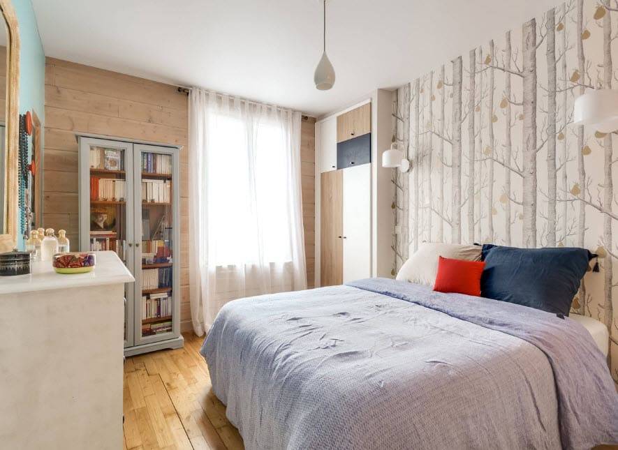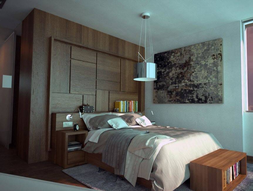 В отделке поверхностей следует применять натуральные материалы и одним из самых удачных решений является древесина. Стены, отделанные деревом, вызывают ассоциации с охотничьими домиками, затерянными в горах. В таких помещениях царит атмосфера романтики, что особенно актуально для спальни.