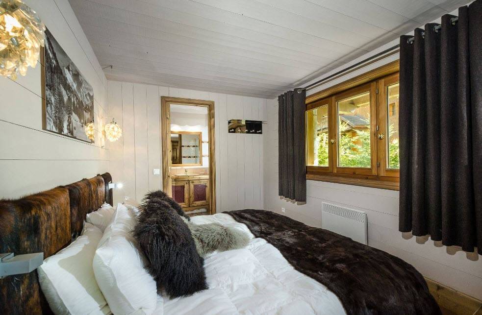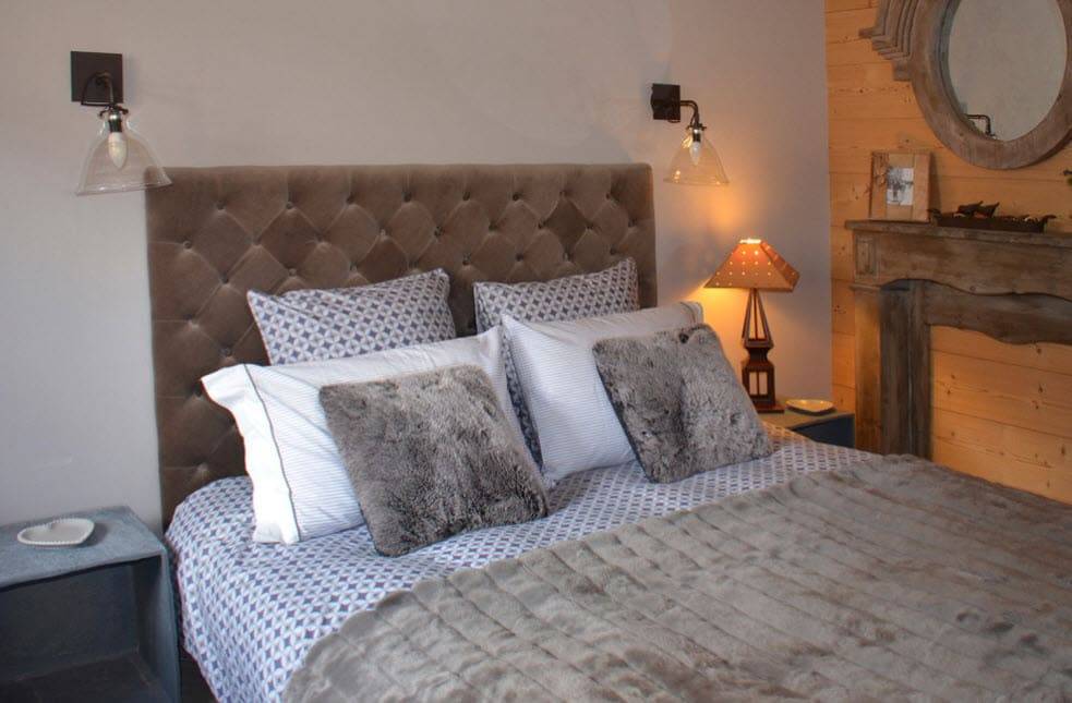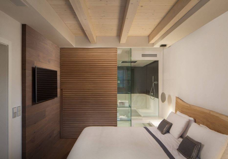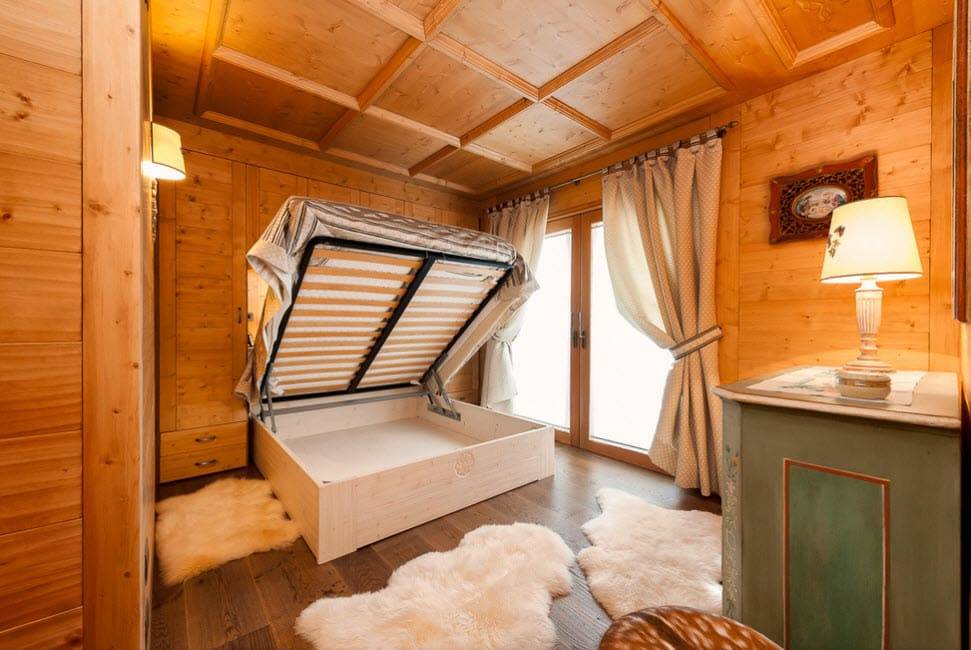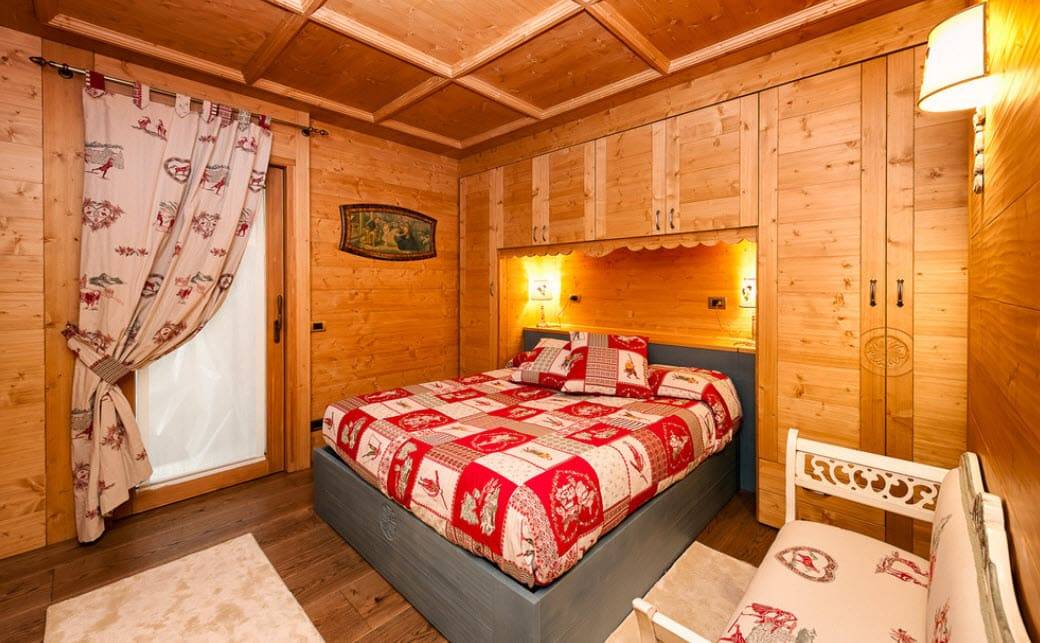 В спальне могут стоять только необходимые предметы мебели, двуспальная кровать, тумбочки и комод. В компактной спальне стены и потолок можно отделать светлой штукатуркой и украсить деревянными балками. Одну из стен может украшать панно из досок. В просторной спальне гармонично смотрится натуральный цвет дерева. Уюта в шале добавит шкура и плед, массивные подсвечники и мягкий рассеянный свет.