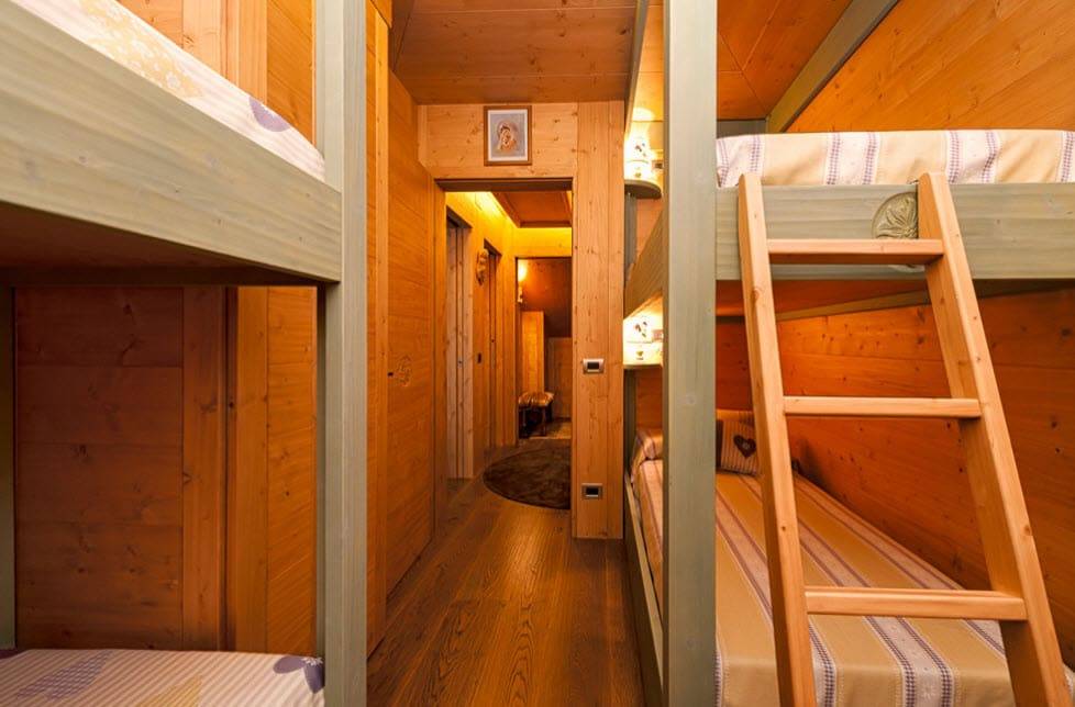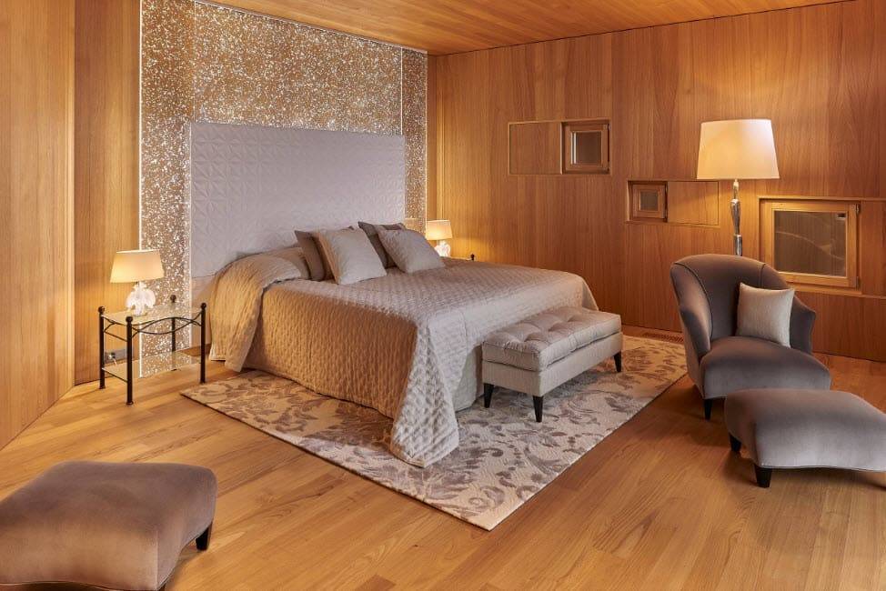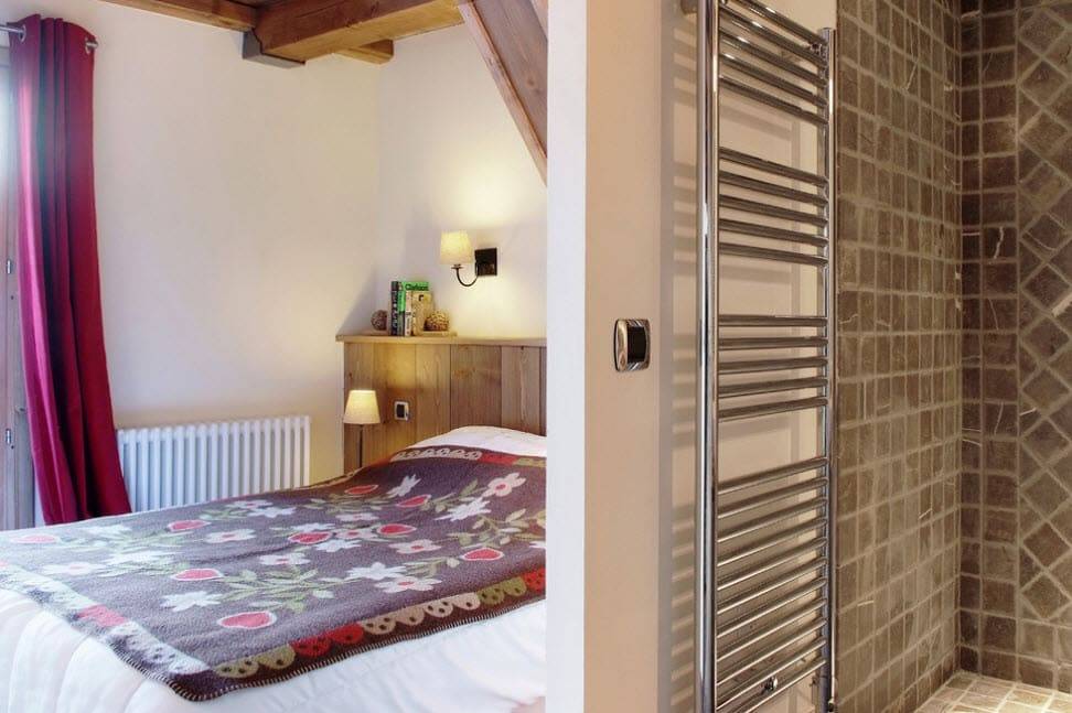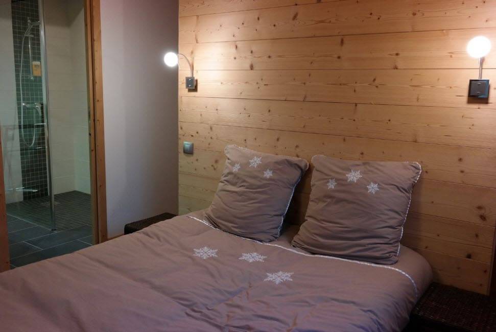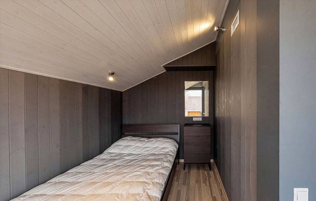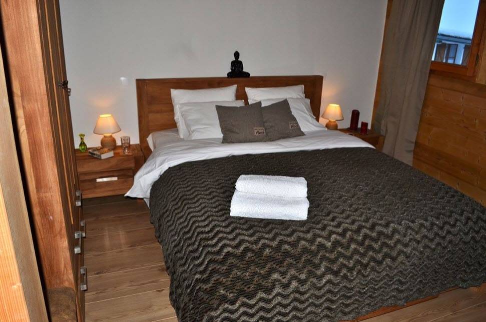 В спальне могут стоять только необходимые предметы мебели, двуспальная кровать, тумбочки и комод. В компактной спальне стены и потолок можно отделать светлой штукатуркой и украсить деревянными балками. Одну из стен может украшать панно из досок. В просторной спальне гармонично смотрится натуральный цвет дерева. Уюта в шале добавит шкура и плед, массивные подсвечники и мягкий рассеянный свет.