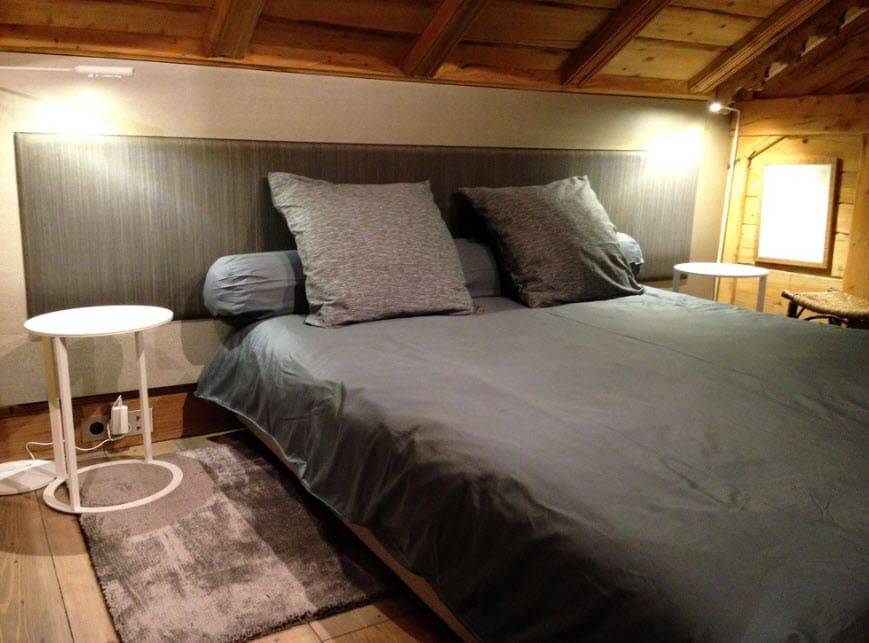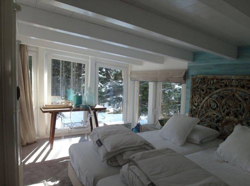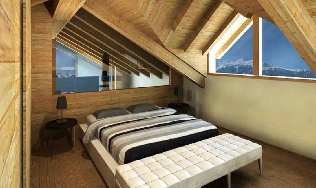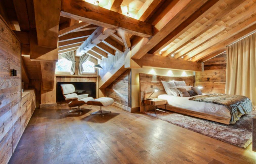 Спальня на мансарде или под другой крышей отлично подходит для создания стиля шале, ведь именно в чердачных помещениях благоустраивали свои спальни жители Альпийских деревень