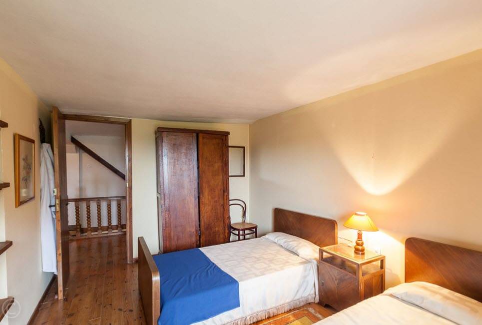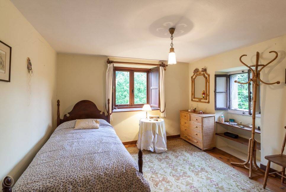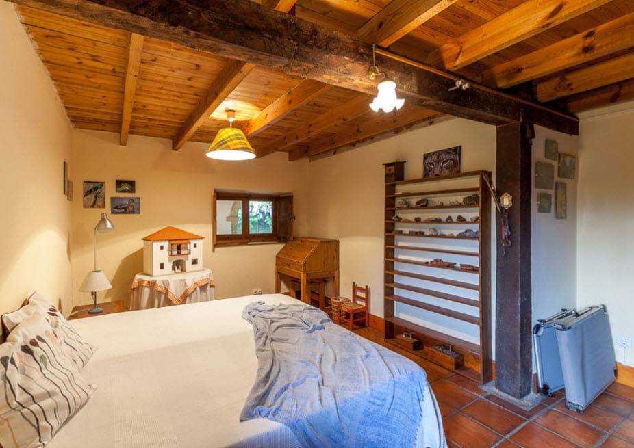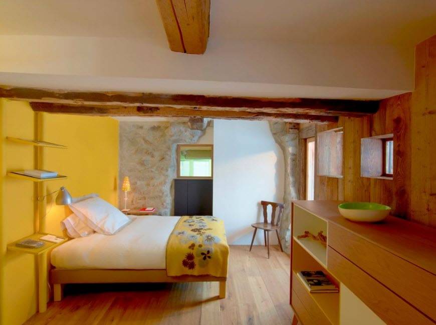 Стены также не требуют особых изысков в оформлении. Чаще всего они просто оштукатуриваются, иногда с применением фактурной штукатурки. Их белят или окрашивают в светлый теплый оттенок и нередко декорируют деревянными балками. Именно в интерьере спальни будет уместно завесить окна шторами из плотного светло-коричневого льна и установить ставни, а дверной проем снабдить массивной деревянной дверью без стеклянных вставок.