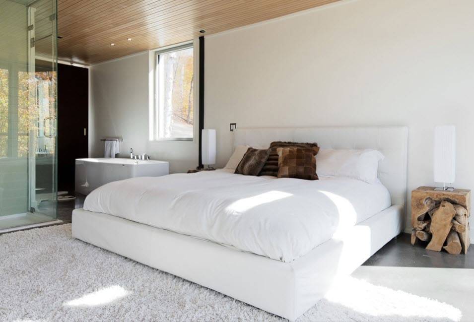 Потолок и пол традиционно отделывается деревянными панелями. Мягкий оттенок дерева и создаваемая им атмосфера тепла и надежности сделает вашу спальню по-настоящему комфортным местом для отдыха. Потолок уместно декорировать балками, а пол застелить пестрыми тканевыми коврами и звериными шкурами.
