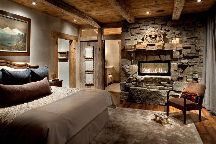 Хорошим решением станет в спальне с интерьером на направлении шале обустройство камина, облицованного каменной кладкой