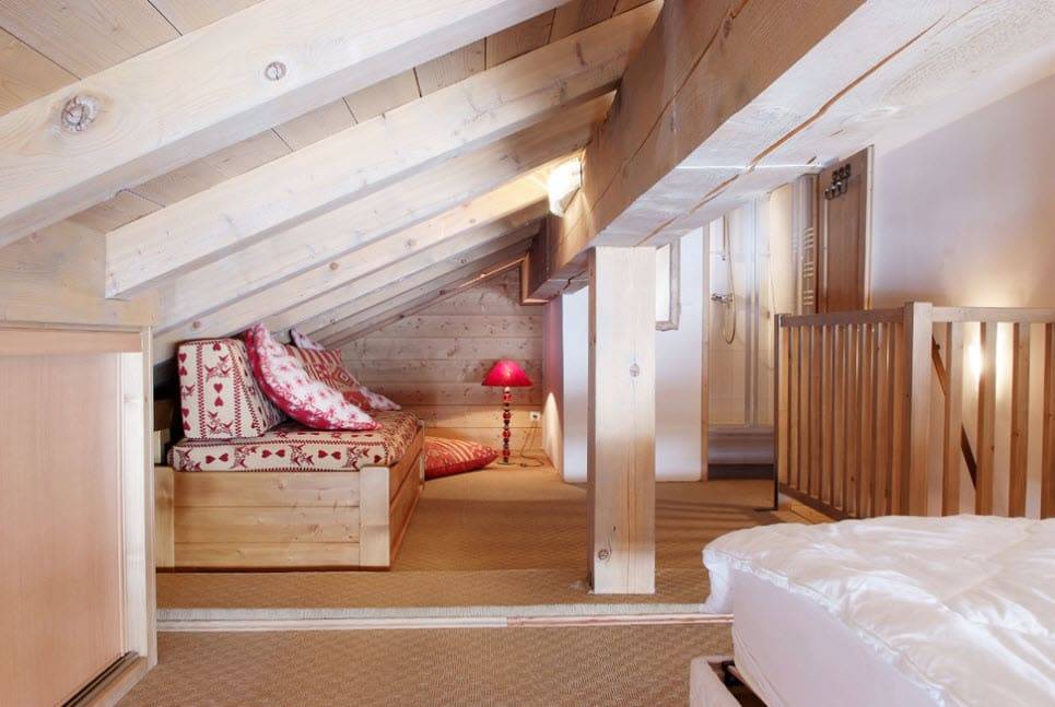 Здесь должна стоят удобная большая кровать, тумбочка и несколько декоративных аксессуаров. Особый шарм придаст шкура медведя на полу и оленьи рога на стене. В старину многие охотники хранили эти вещи именно на чердачных помещениях.