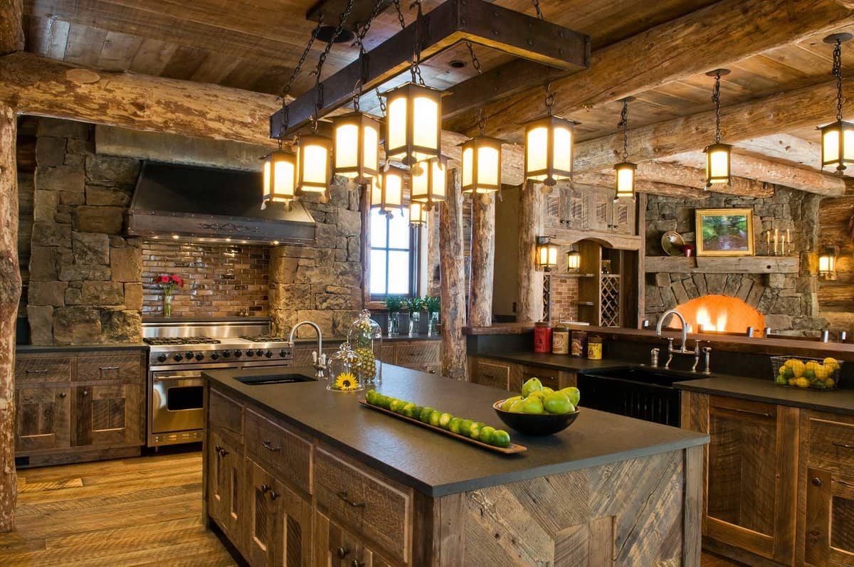 Особую прелесть и неповторимый шарм кухне шале придают развешанные на стенах шкуры диких животных, рога копытных, меховые изделия и прочие трофеи охоты. Ключевое и наиболее значимое место в кухне шале занимает камин. Источник тепла и домашнего уюта, выложенный из природного камня, устанавливается на самом видном месте.