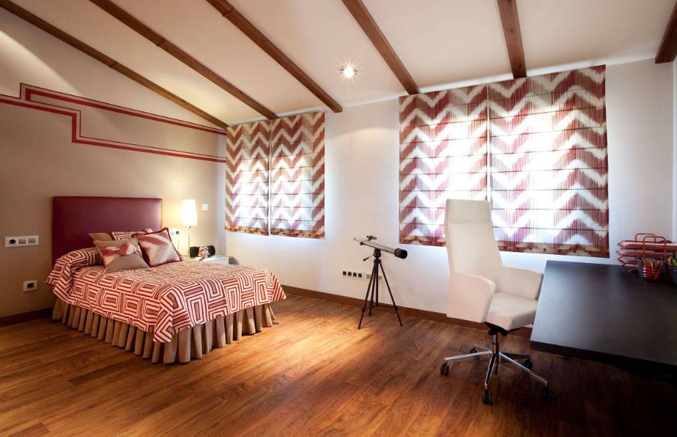 На фото спальня с покатым потолком, декорированным деревянными балками.
