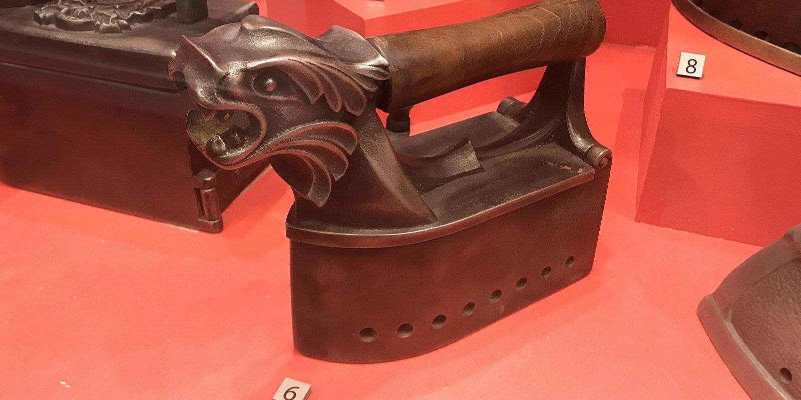 Среди ценных экспонатов угольного раздела привлекают внимание российский утюг «Петух» (количество сохранившихся до наших дней экземпляров измеряется штуками) и его скандинавский собрат «Драккар», увенчанный головой дракона точь-в-точь как боевой корабль викингов