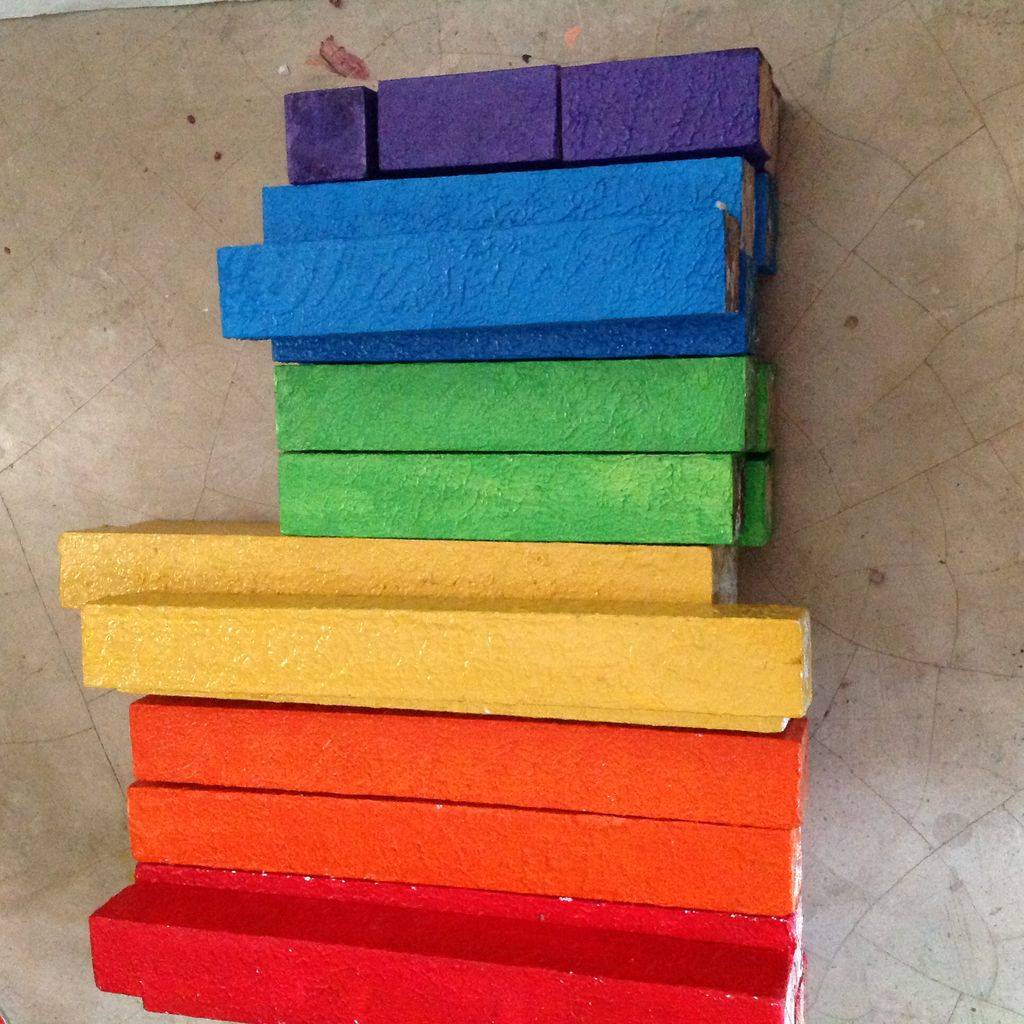 4 ножки мы покрасили в фиолетовый цвет, затем 5 стоек в голубой, 4 стойки в зеленый, снова 5 балок, но уже длинных, – в желтый, 4 стойки в апельсиново-оранжевый и 5 оставшихся балок в красный цвет.