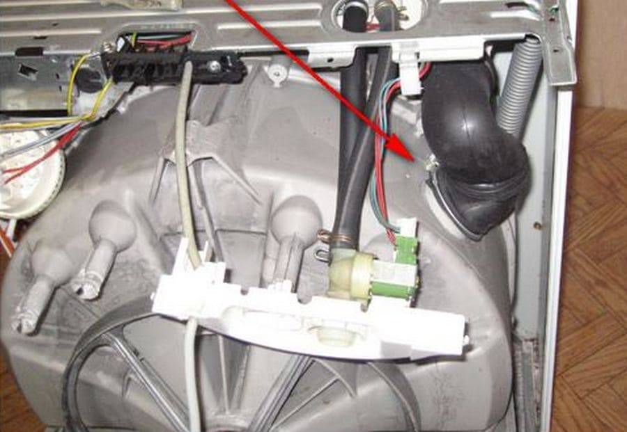 - Если стиральная машина протекает в процессе набора воды, возможно, поврежден патрубок, который идет из контейнера для чистящих средств к заливному клапану.