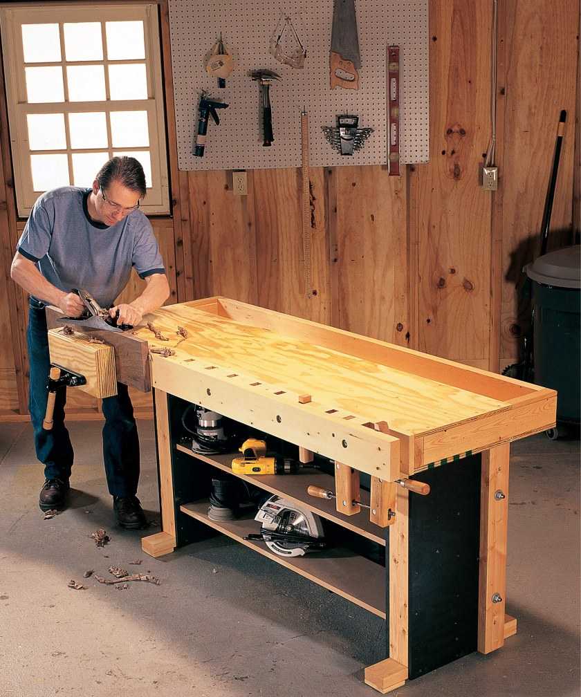 Совсем другое дело – дерево. Чтобы сделать для гаража деревянный верстак своими руками, необходим будет только стандартный набор домашнего инструмента – болгарка, отвертка, электрический лобзик, молоток и т. д