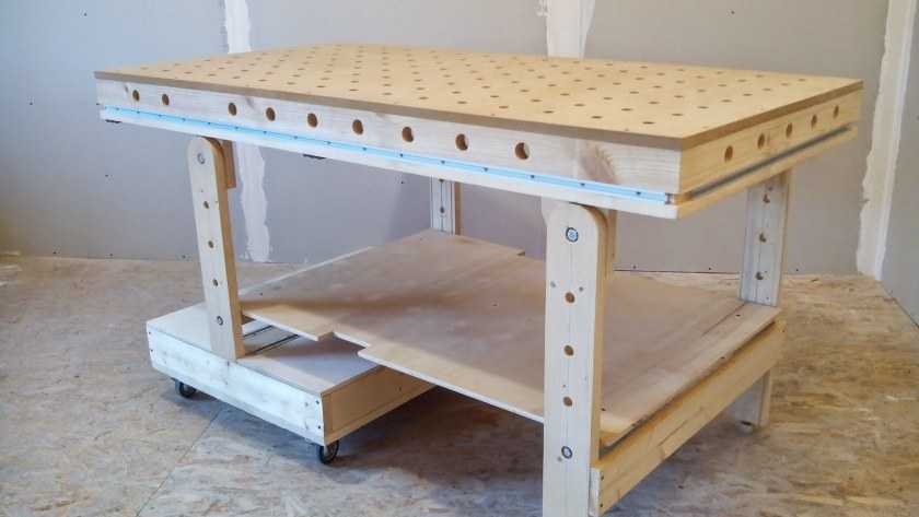 Длина столешницы должна быть такой, чтобы на ней с легкостью размещались инструменты и крупные детали, которые требуются для работы. Ширина ее не должна быть больше 50 – 60 см. Это позволяет дотягиваться без труда до противоположного края. Одна сторона может быть оборудована для работы с электрическим режущим инструментом: циркулярной пилой, лобзиком и т. п. С этой целью закрепляют дощечку таким образом, чтобы она выступала за край верстака на 200 – 300 мм.
