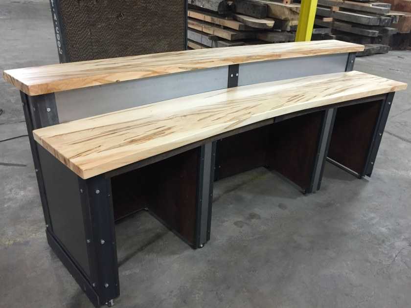 Конструкция, изготовленная из этих материалов, будет надежной и очень прочной. Доски будут использоваться для ниш и полок, а стальные полосы понадобятся, чтобы создать бортики на поверхности стола.