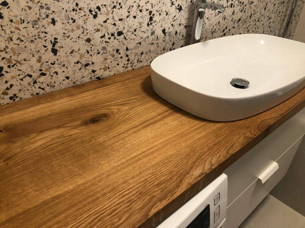 На рынке представлен очень широкий ассортимент деревянных столешниц и досок со шпоном под дерево. Стоит ли выбирать натуральный материал, например дерево, или доску? Ответ прост: только деревянная столешница — это элемент, который действительно украсит вашу ванную комнату! Дерево, предназначенное для столешниц, водонепроницаемо. Покрывая их дополнительно маслом или лаком, вы создадите полностью сохранившуюся деревянную поверхность. Стоит сделать ставку на изделие из массива дерева. В случае древесно-стружечных плит необходимо следить за тем, чтобы места разрезов и стыков были хорошо изолированы, например, силиконом.
