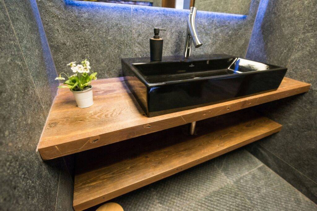 Добавляя деревянные элементы в ванную комнату, вы создаете дружелюбный интерьер. Столешница или другая отделка из дерева приятны на ощупь. Обратите внимание, что деревянная столешница для ванной комнаты находится в центре. Это также первый элемент его оборудования, с которым сталкиваются гости. Поэтому стоит сделать в ванной комнате сильный акцент в виде столешницы из настоящего дерева!