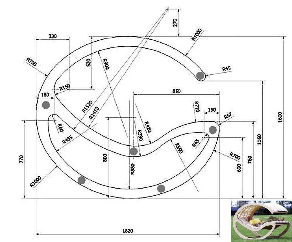 И те, и другие запросы удовлетворит садовая качалка-лежак на эллиптических полозьях и с тентом. Размеры ее боковин даны на рис; их материал – фанера 24 мм. Ширина ложа – до 900 мм, ее обшивка из реек 50х50. Места боковин, обозначенные серыми кружками, соединяются круглыми деревянными поперечинами диаметром от 60 мм.