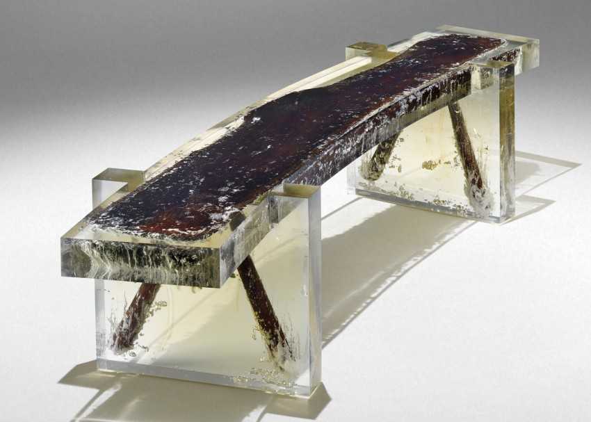 Также стоит вставить три ножки из веток или бревен вглубь обруча в эпоксидную смолу, чтобы ножки прочно прилипли к табурету. Табурет практически готов, остается только дождаться того волшебного момента, когда эпоксидная смола застынет. После этого останется пройти шлифовальной машинкой по сидению табурета, снять верхний слой эпоксидки, и взору откроется действительно чарующее зрелище в виде парящих в смоле круглых кусочков дерева различного размера и рисунка. Табурет будет не только выглядеть предельно роскошно, он также прослужит долго, так как эпоксидка будет надежно удерживать декоративные кусочки дерева и ножки, не позволяя им сломаться.
